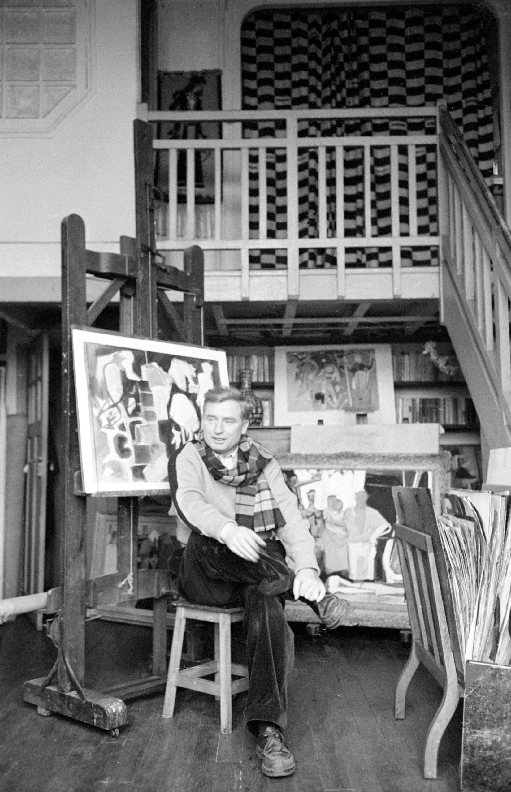 Black and white photograph of a man seated on a stool in an artist's studio, surrounded by paintings and an easel, with a geometric textile visible on an upper balcony