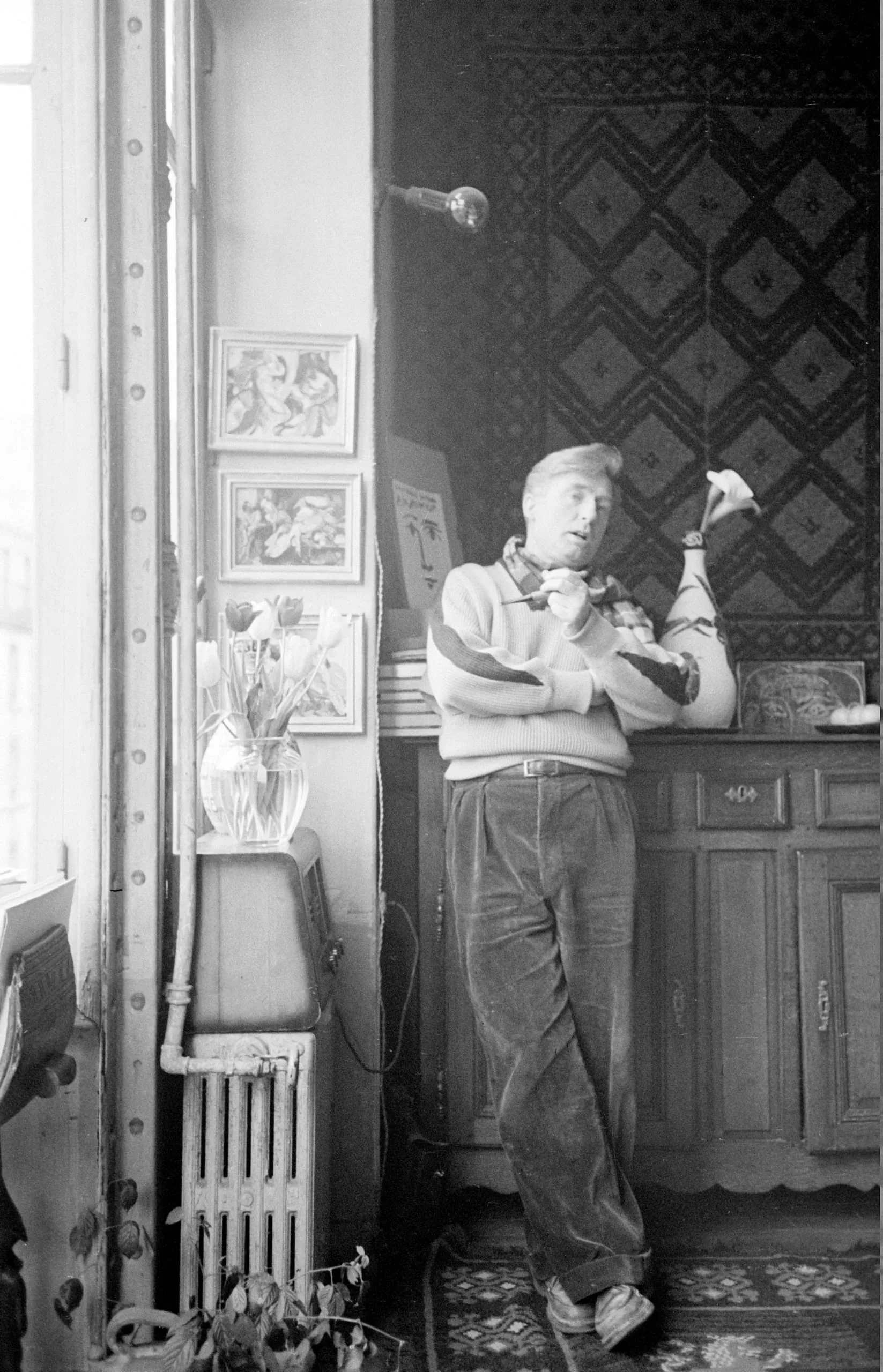 Black and white photograph of a man in a striped sweater and wide trousers, head tilted back, standing in a room with patterned wallpaper, framed artworks, and a flower-filled vase