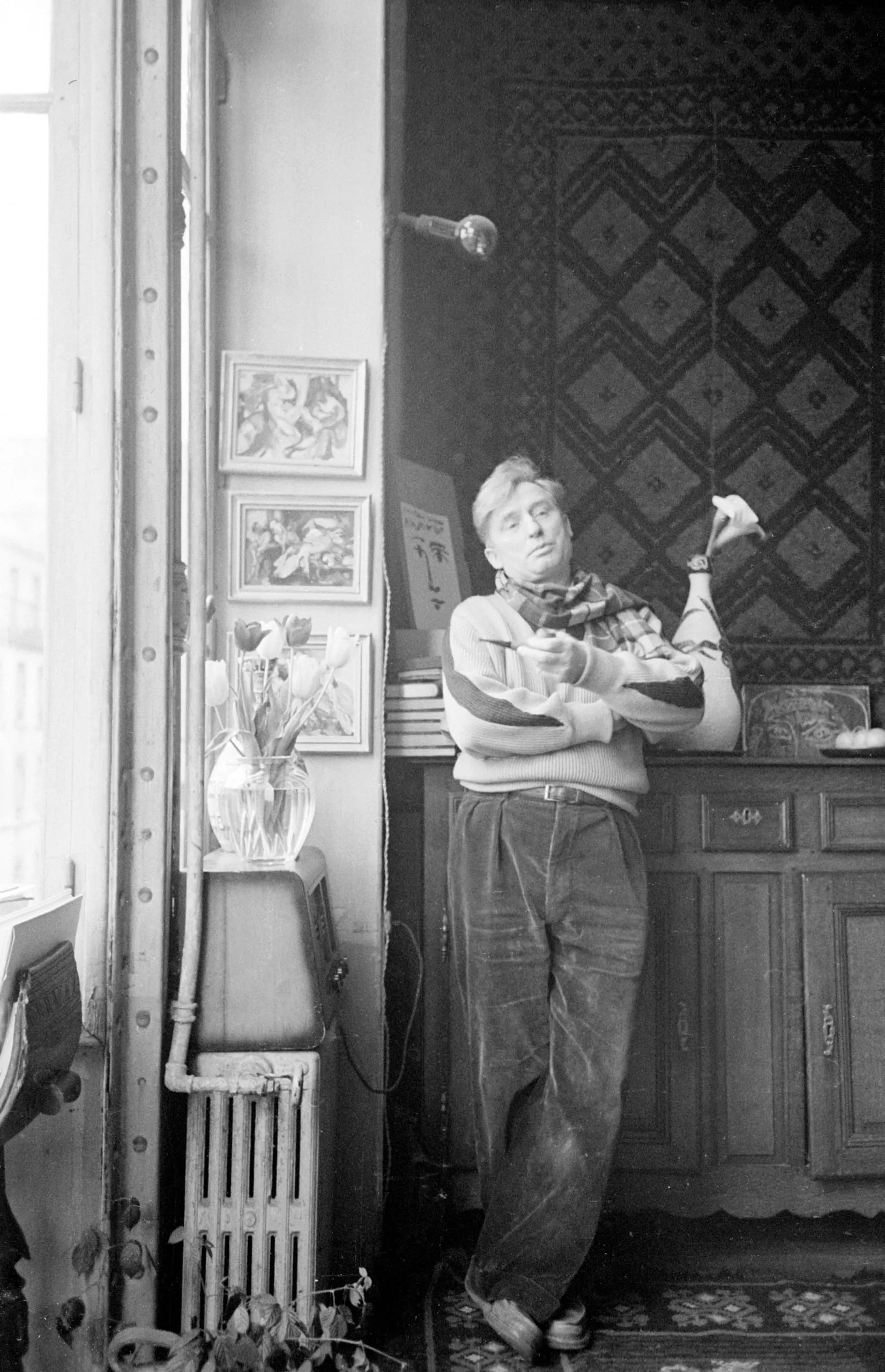 Black and white photograph of a man in a striped sweater and loose trousers leaning against a doorframe indoors, head tilted back, one hand raised