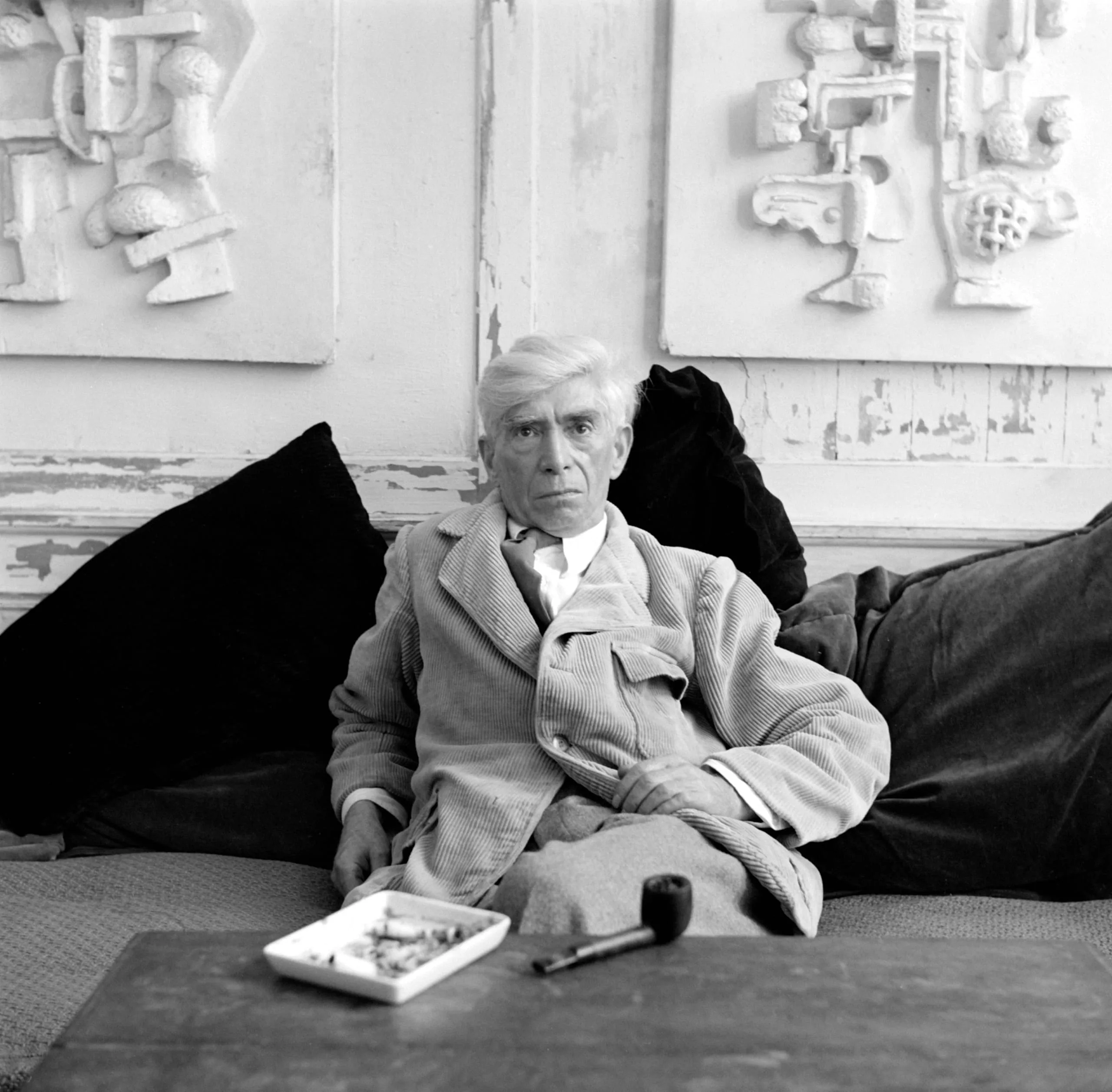 Black and white photograph of an older man in a corduroy coat seated among dark cushions, with two white abstract relief sculptures mounted on a peeling wall behind him