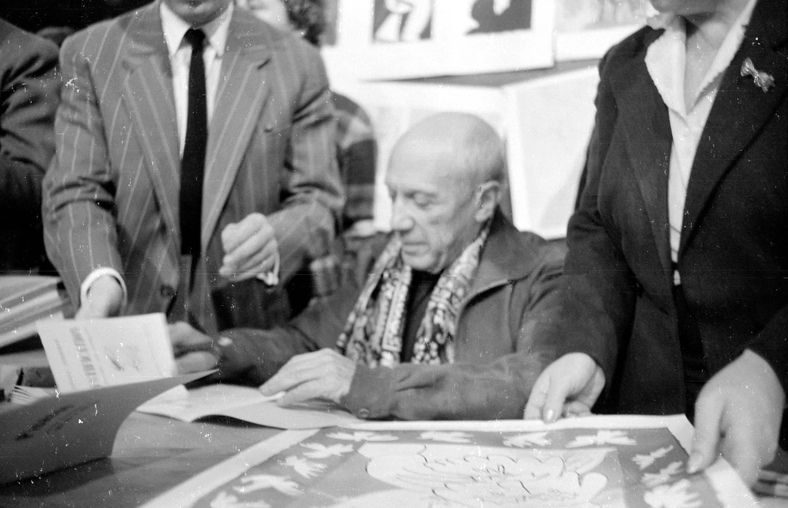 Black and white photograph of a bald elderly man seated at a table leaning over a large printed sheet, flanked by two standing figures, in an indoor exhibition space
