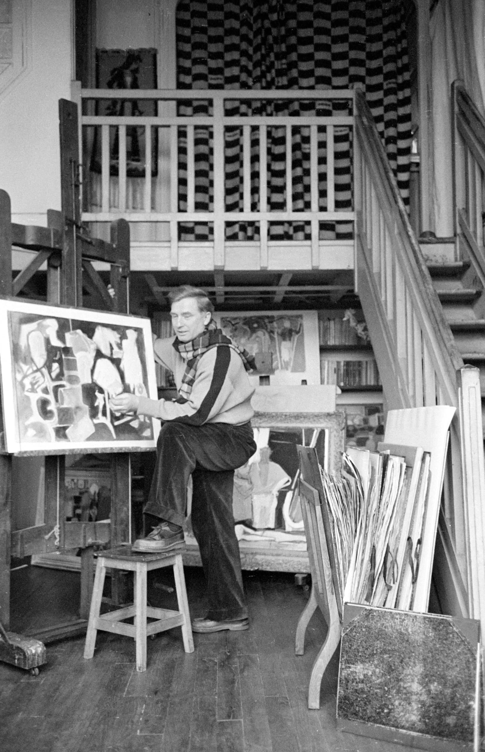 Black and white photograph of a man seated on a wooden stool before an easel in an artist's studio, reaching toward an abstract canvas, surrounded by stacked paintings and a staircase