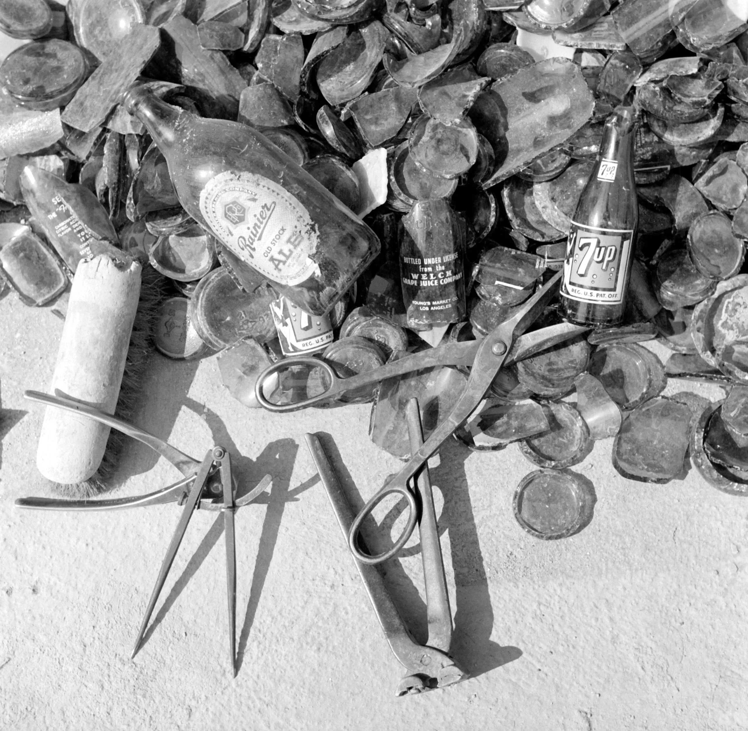 Black and white photograph looking down at a pile of glass bottle bottoms and intact labeled bottles alongside open scissors and a drafting compass on a concrete surface