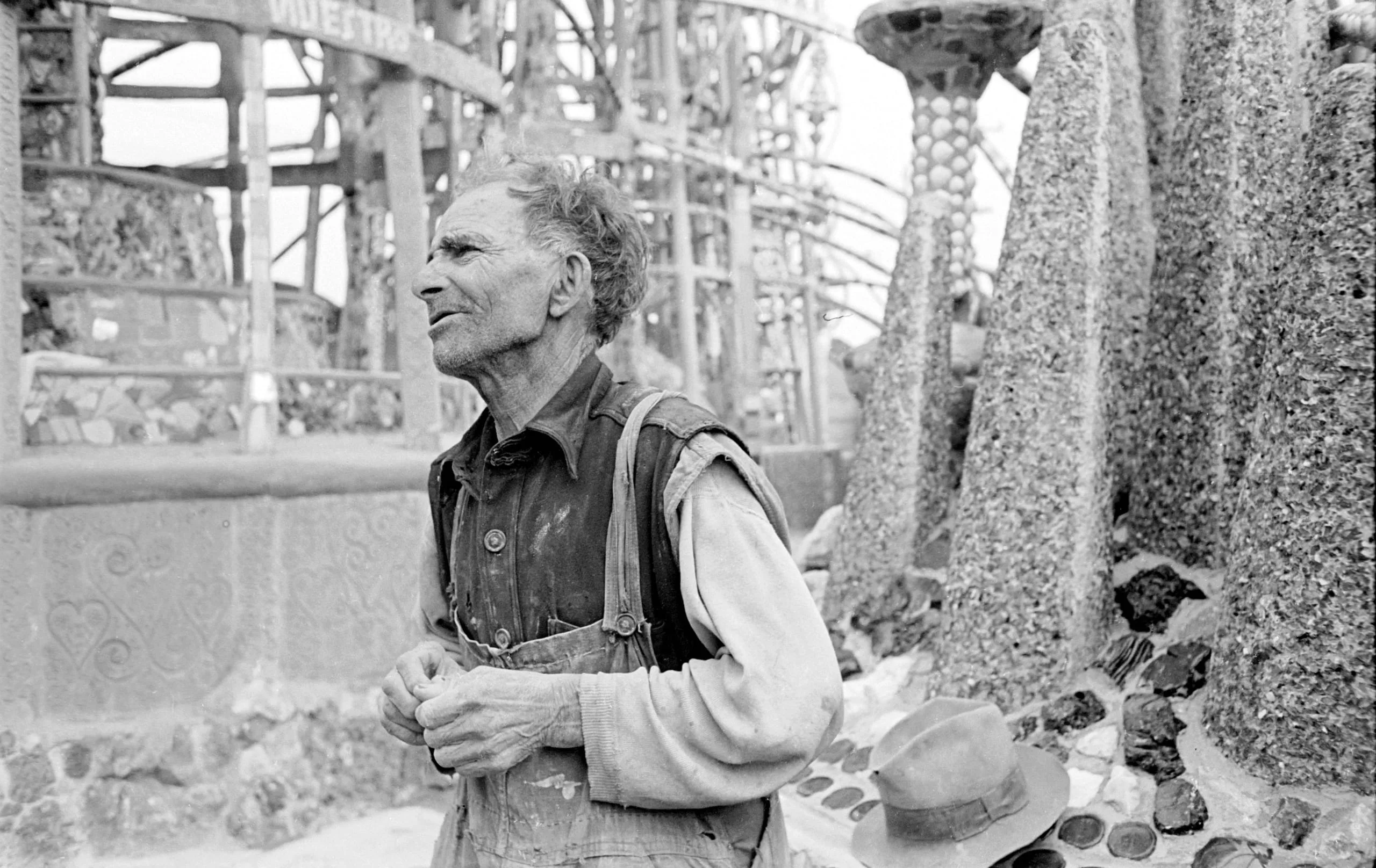 Black and white photograph of an elderly man in worn overalls and work shirt standing among towering mosaic-covered structures and arching steel frameworks outdoors