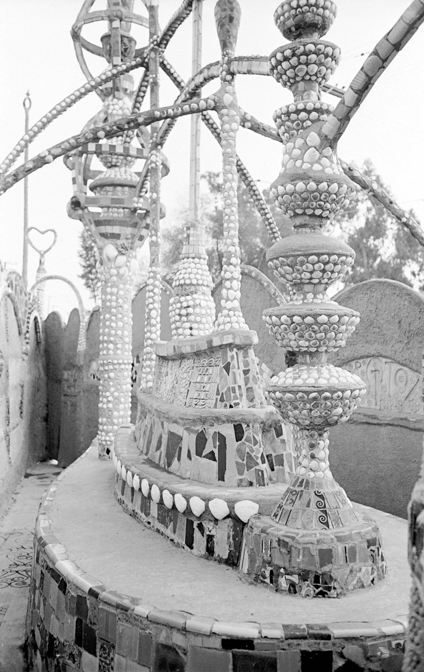 Black and white photograph of an outdoor mosaic environment with shell-studded concrete columns, tiered pedestals, and arching spires rising above curved tile-covered walls