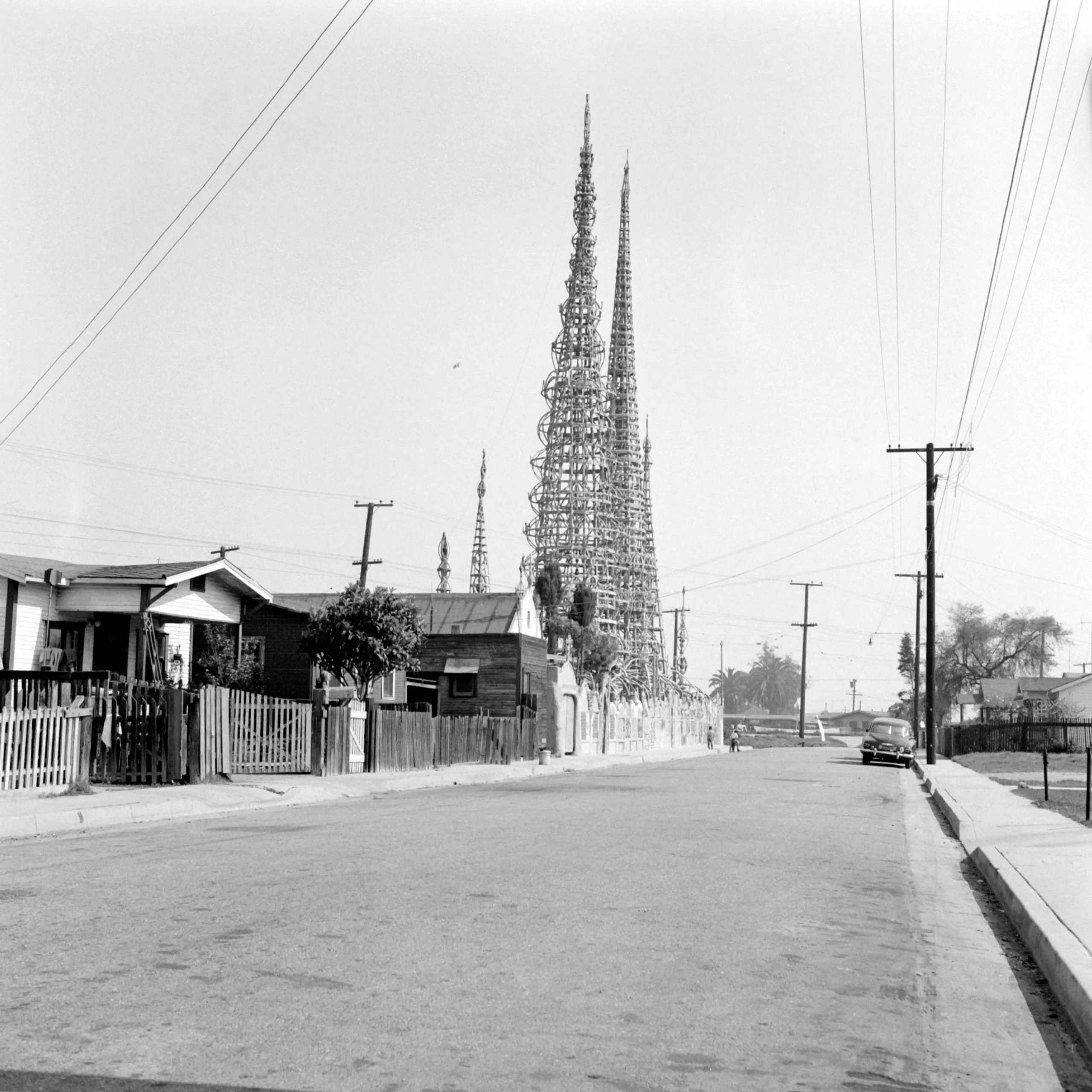 Black and white photograph of a residential street with two towering latticed steel spires rising above low wood-frame houses and utility poles