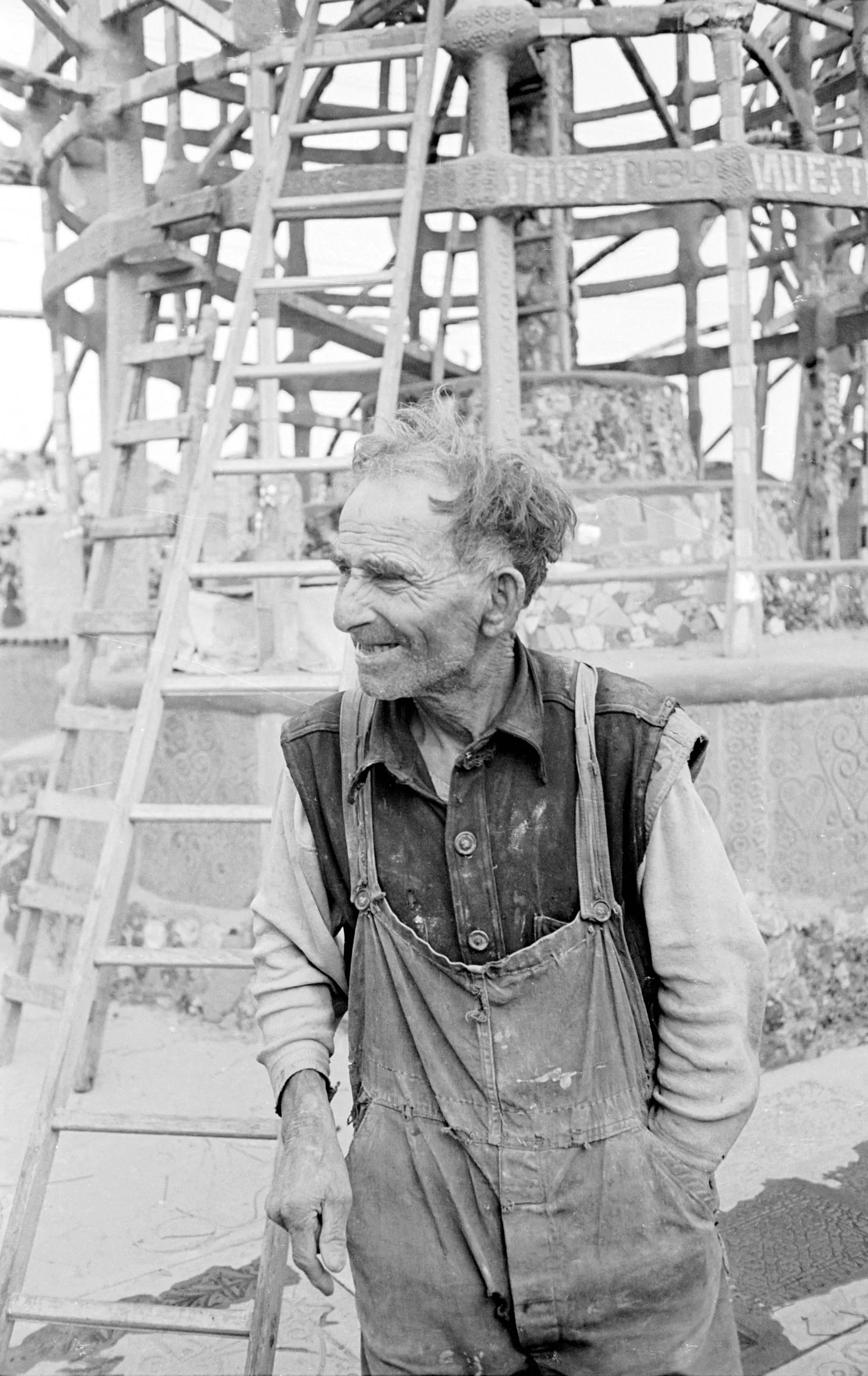 Black and white photograph, elderly man in stained denim overalls standing in front of a large open-framework tower with embedded mosaic materials and wooden ladders