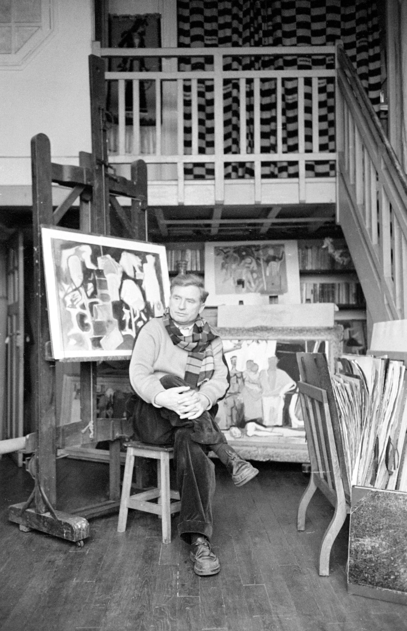 Black and white photograph of a man seated on a stool in an artist's studio, surrounded by canvases, an easel, and a mezzanine hung with a geometric textile