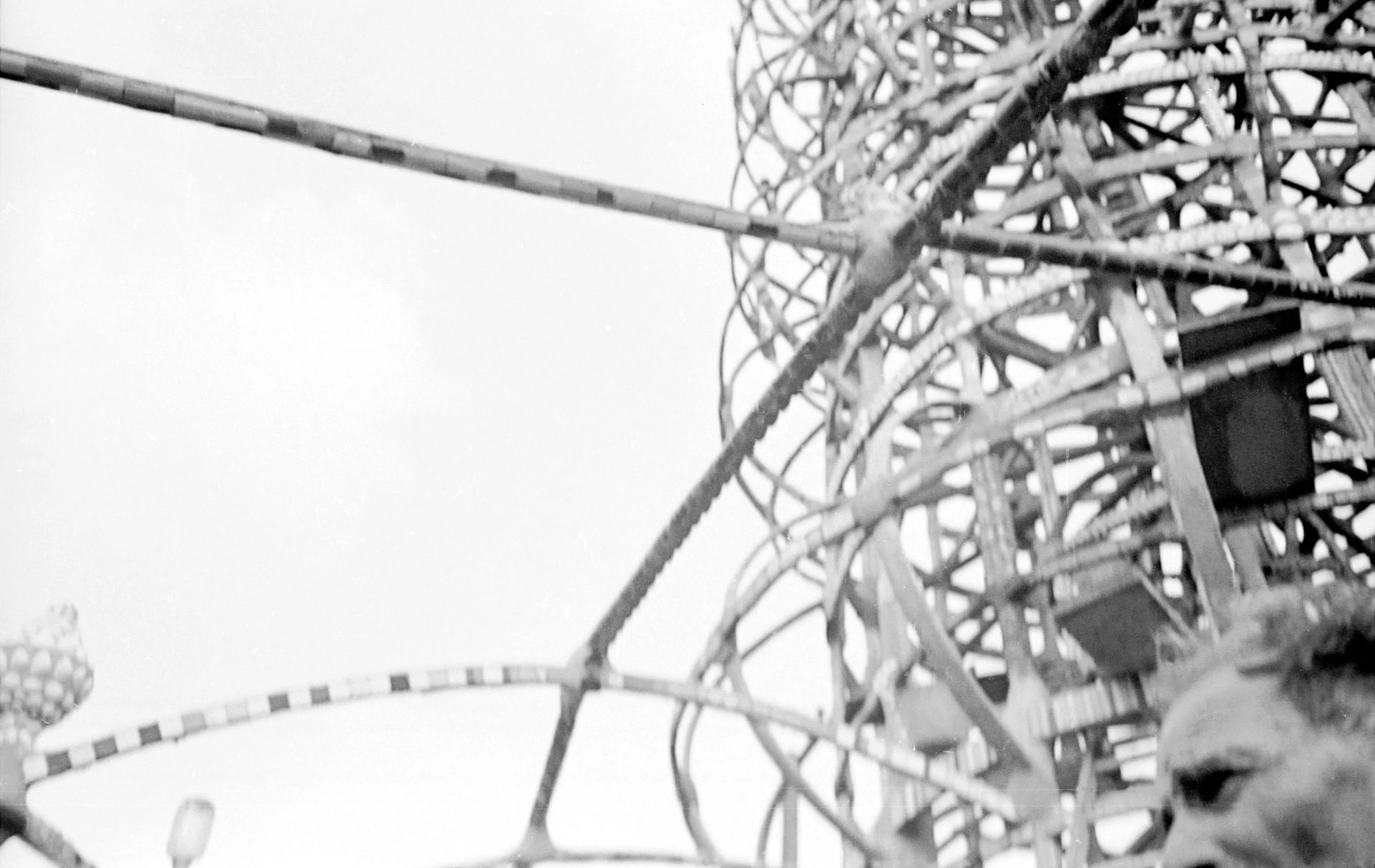 Black and white photograph looking up at tangled wooden roller coaster tracks and support scaffolding against an overcast sky