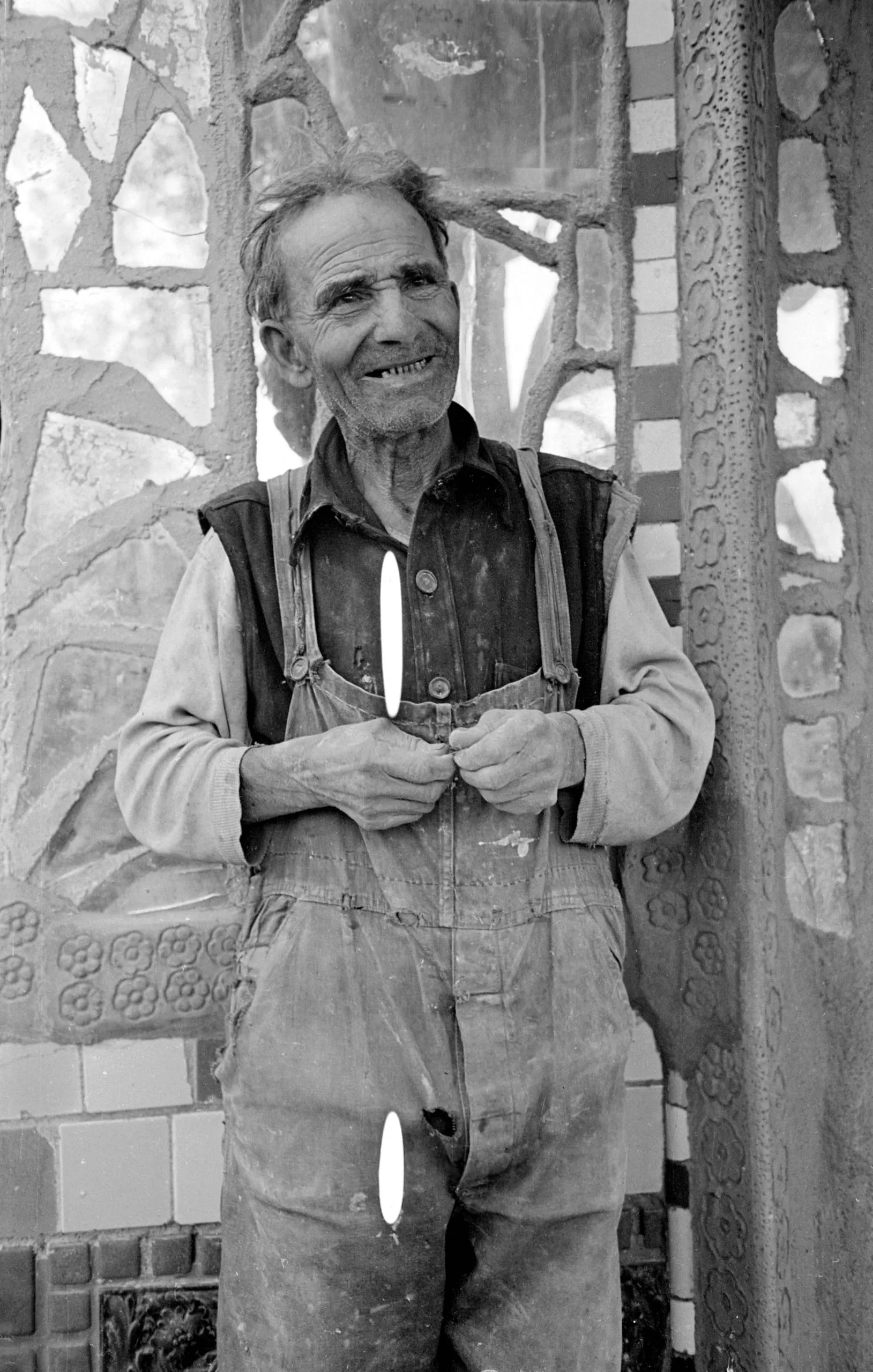 Black and white photograph, full-figure portrait of an older man in worn overalls, smiling, leaning against a mosaic-covered column