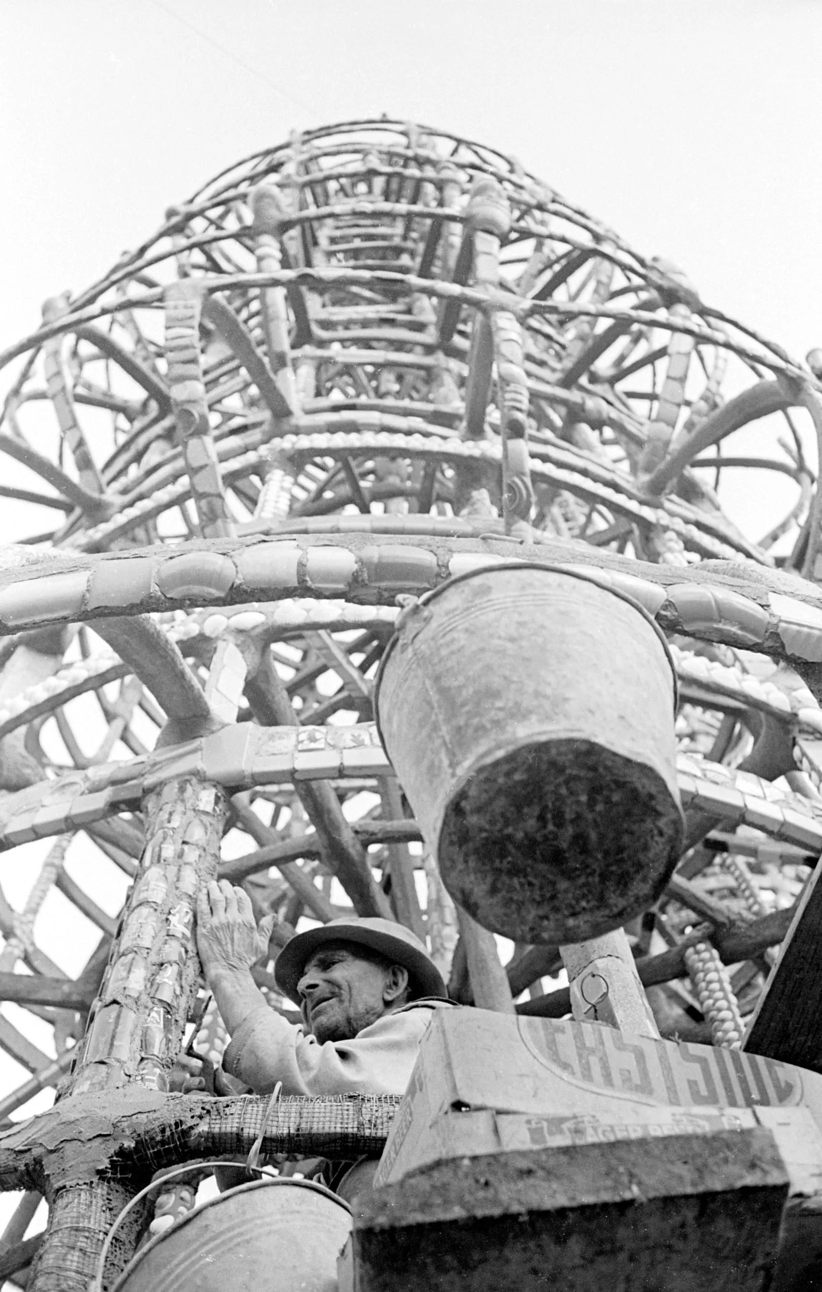Black and white photograph, low-angle view of a smiling man in a brimmed hat beside a massive lattice tower made of bundled rods rising overhead
