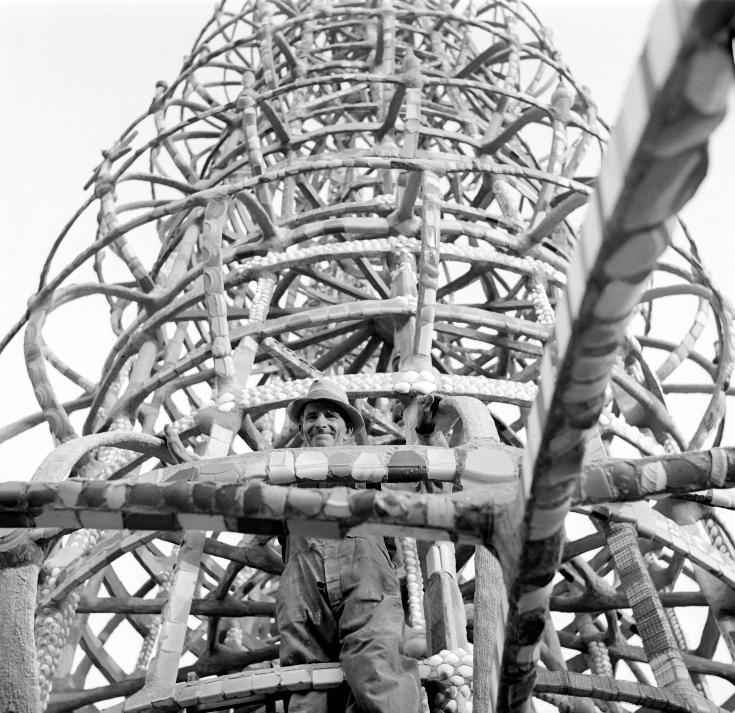 Black and white photograph looking steeply upward at a towering lattice structure of rod and mosaic-studded crosspieces, with a smiling man in a work hat standing within the lower framework