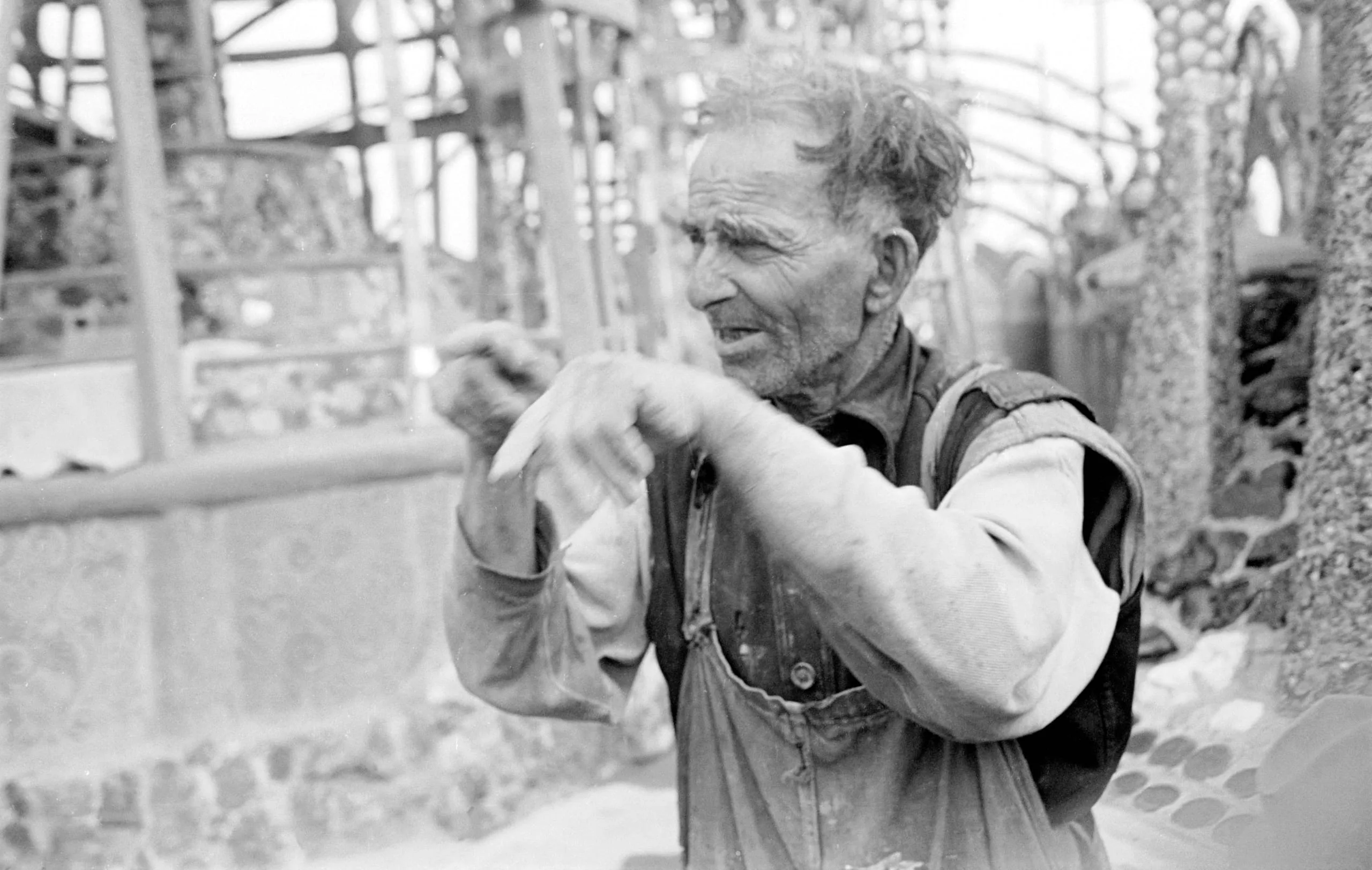 Black and white photograph of an older white man in denim overalls and rolled-up sleeves, gesturing with both hands raised, standing before a latticed sculptural outdoor structure