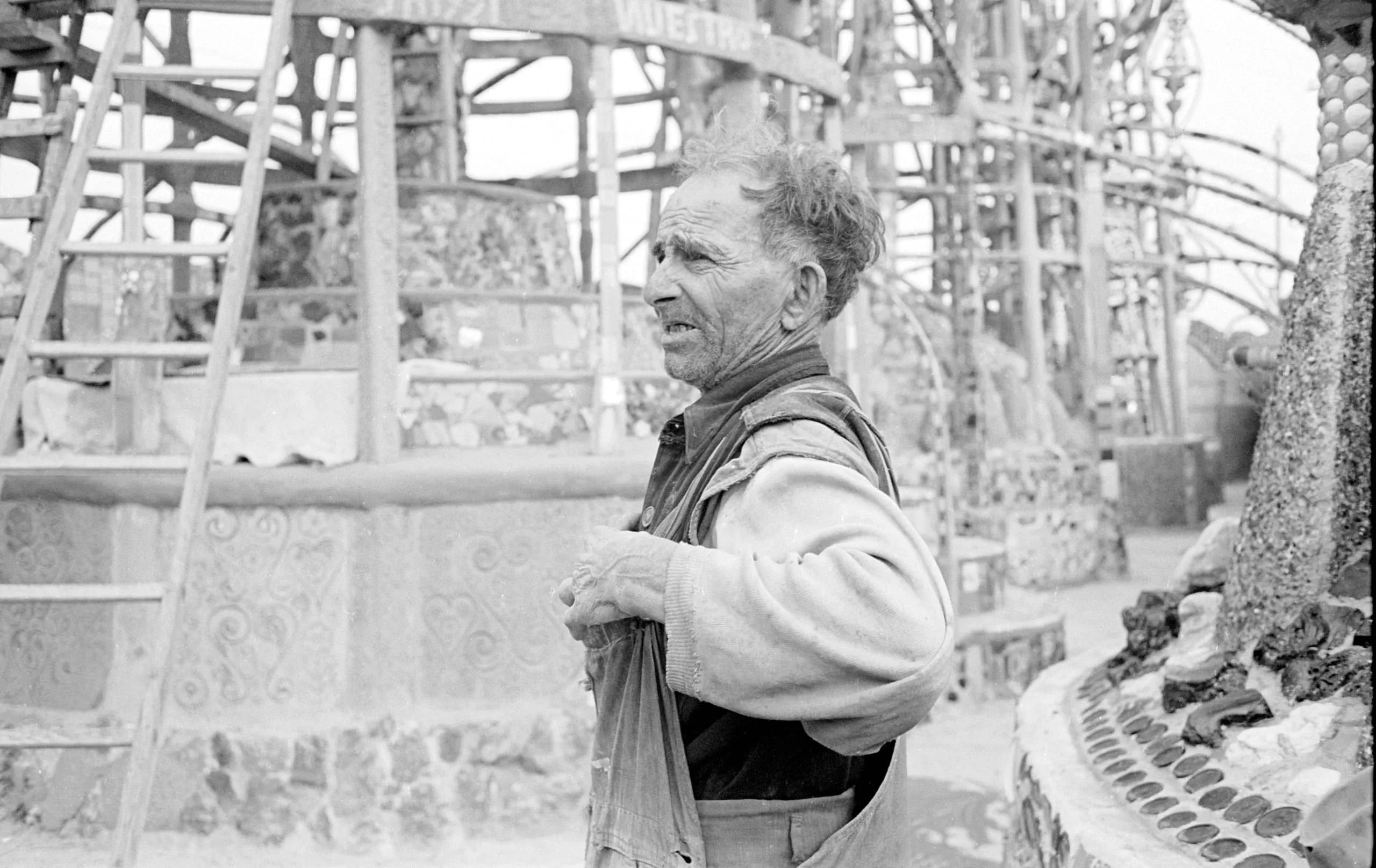 Black and white photograph of an older man standing amid large mosaic-covered outdoor sculptures, body turned slightly right, lips parted