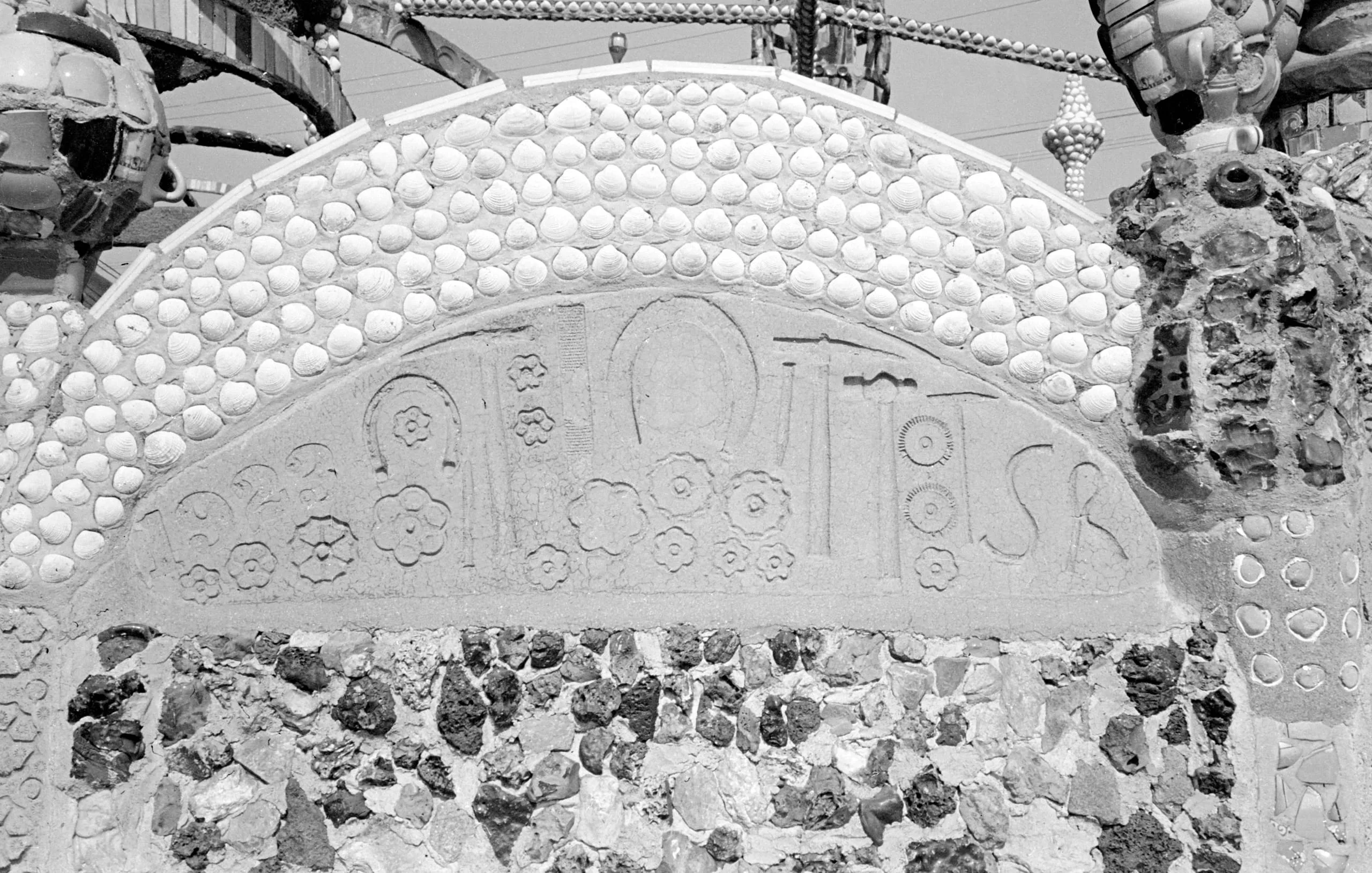 Black and white photograph of a concrete arch encrusted with shell-like objects above a carved inscription panel reading 'MOTTS,' flanked by rough stone walls and mosaic-covered columns