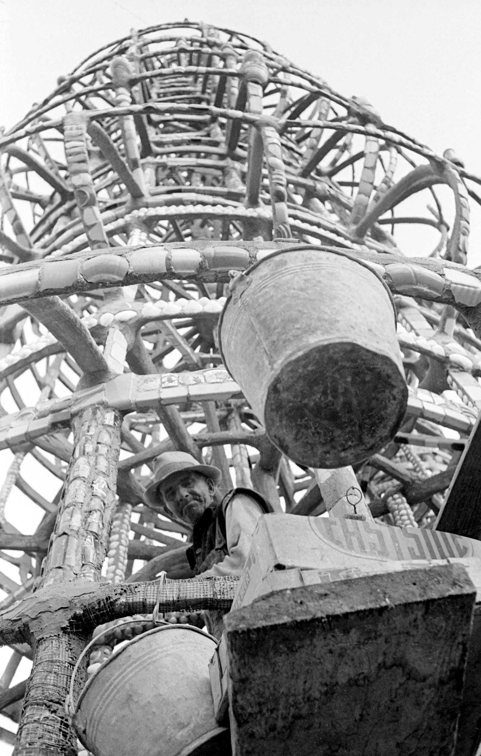 Black and white photograph shot from below looking up at a massive open-lattice tower structure, with a man in a work hat visible among large cylindrical concrete forms