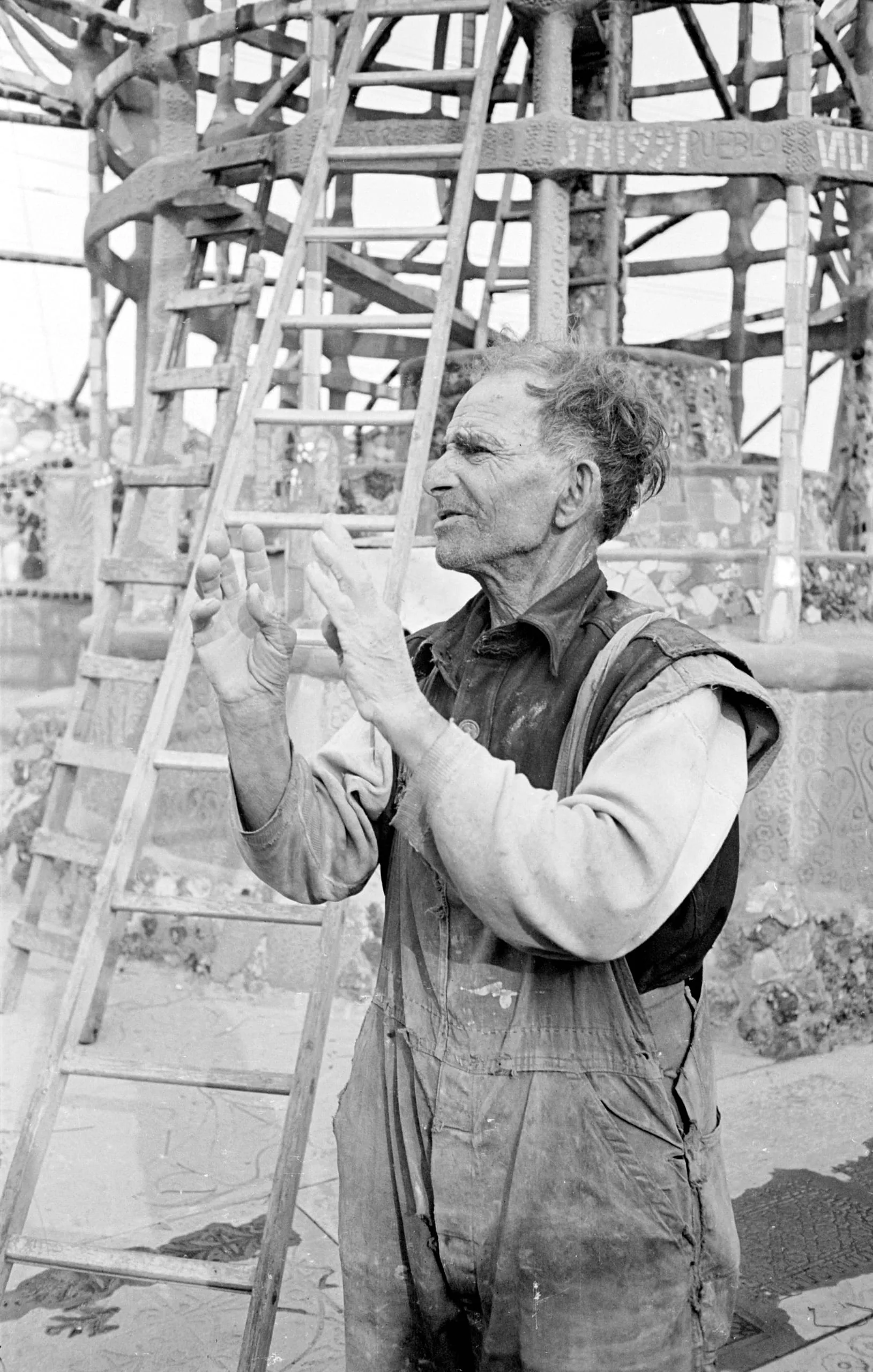 Black and white photograph of an older man in work overalls and plaster-dusted hands standing before a tall wooden scaffolding structure outdoors