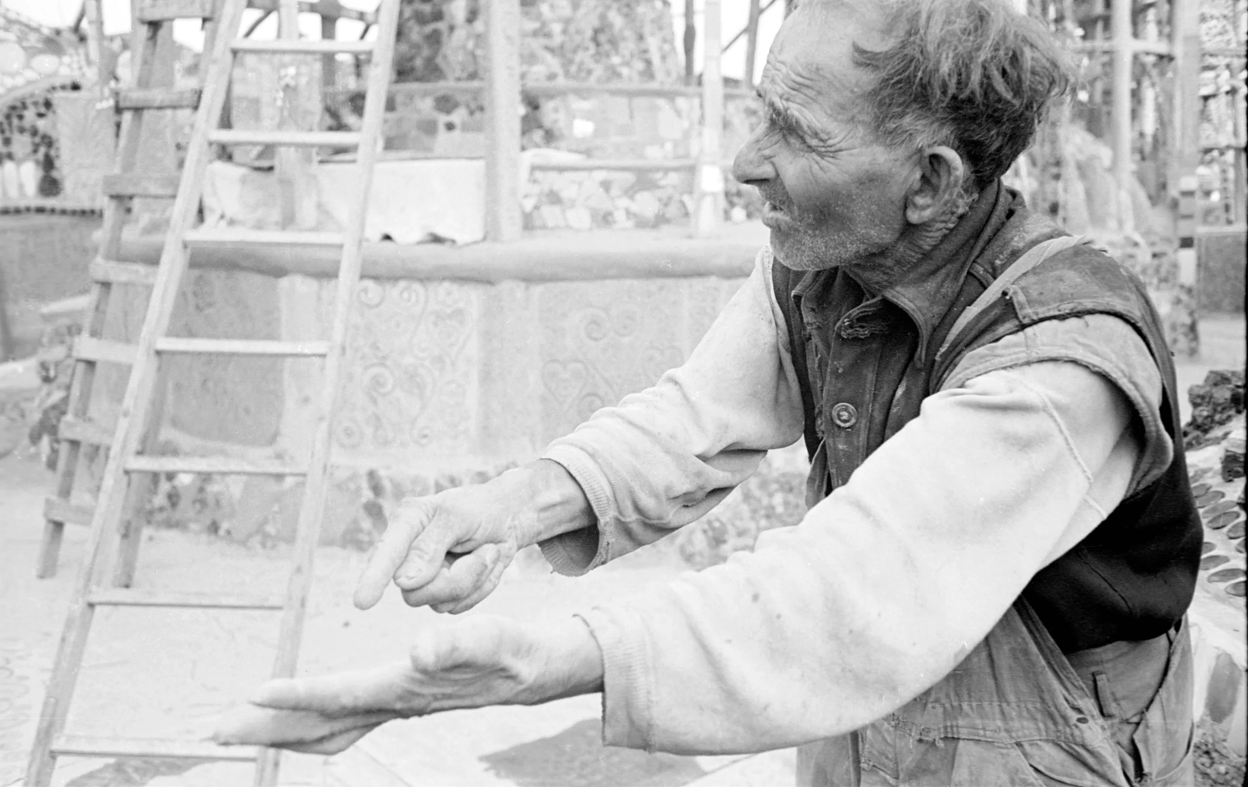 Black and white photograph of an older man in profile, arms extended with dust-covered hands, working outdoors beside a wooden ladder and a mosaic structure