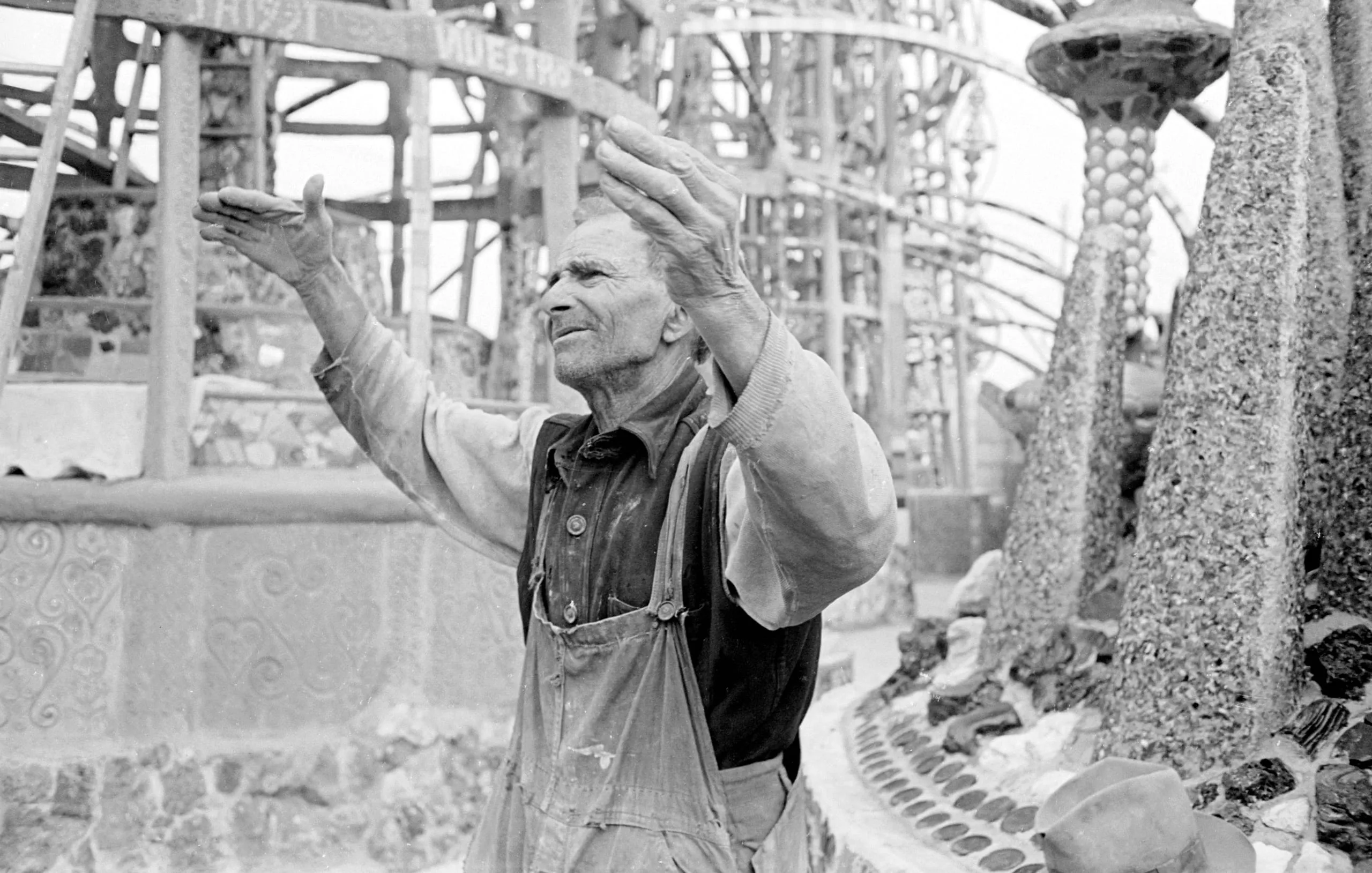 Black and white photograph of an older man in dusty overalls with both arms raised, surrounded by mosaic-covered towers and lattice structures