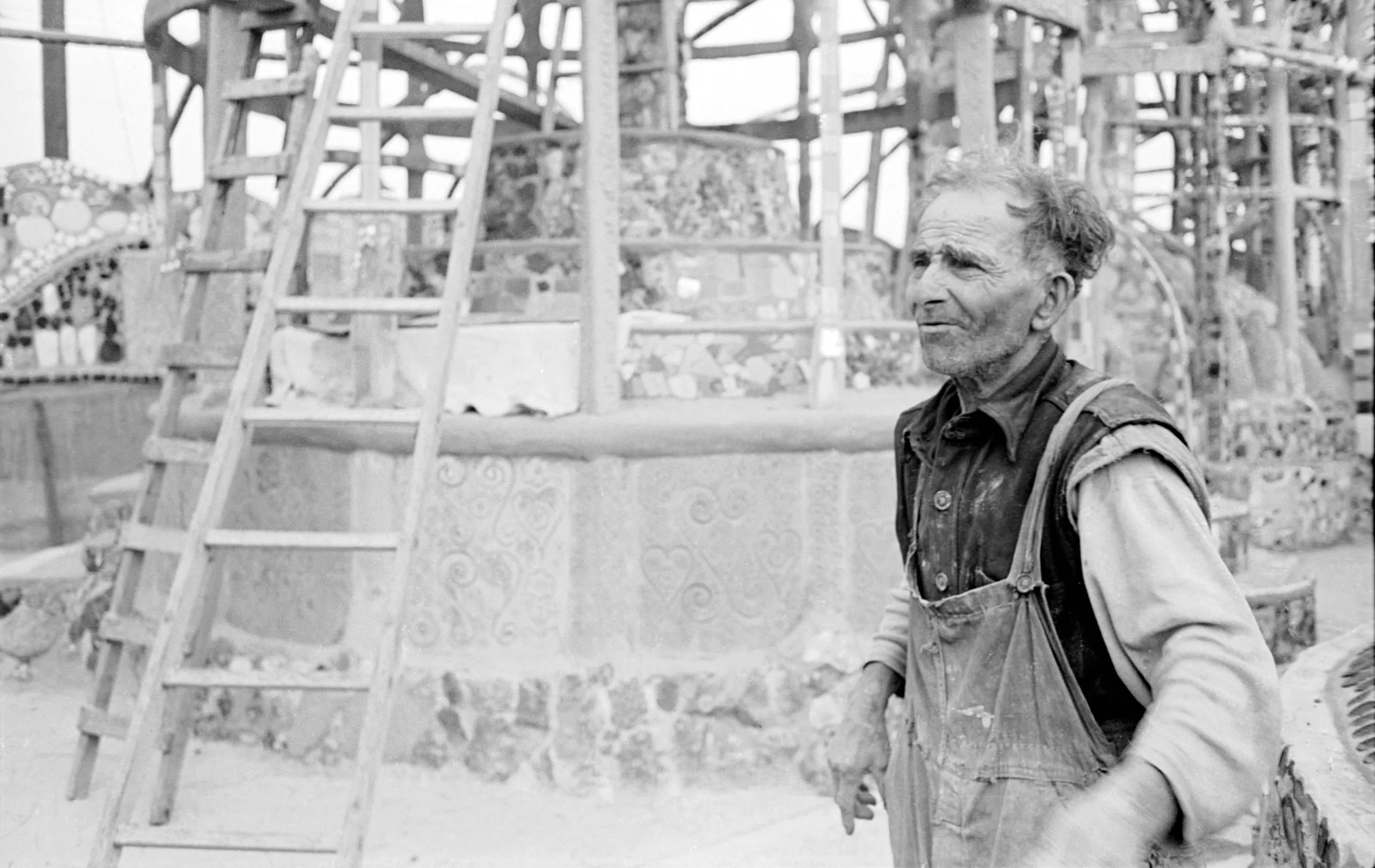 Black and white photograph of an older man in worn denim overalls standing among large mosaic-covered concrete structures under construction, with wooden scaffolding visible behind him