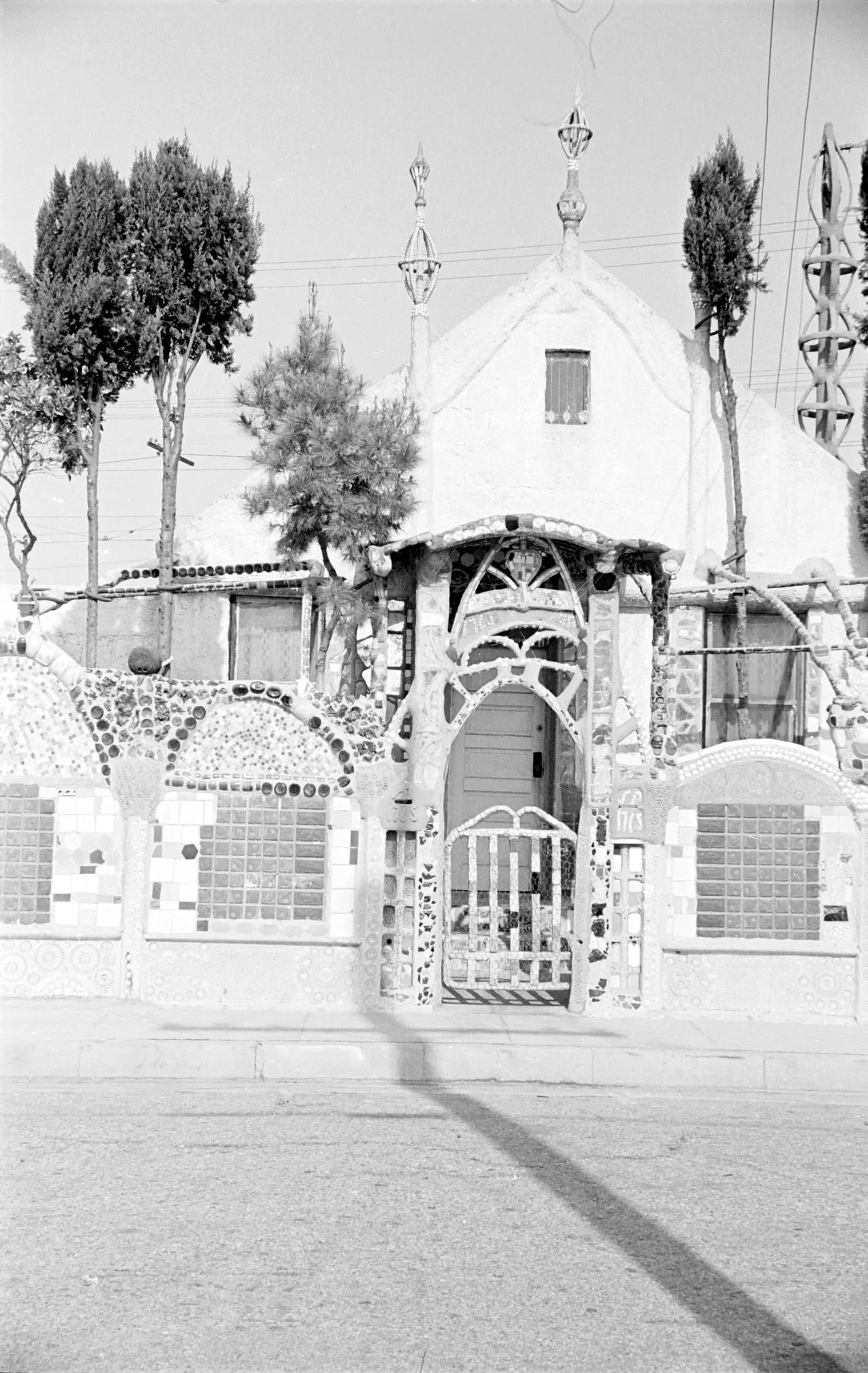 Black and white photograph of a white stucco house behind an elaborate mosaic and encrusted stone fence with an ornate arched gateway