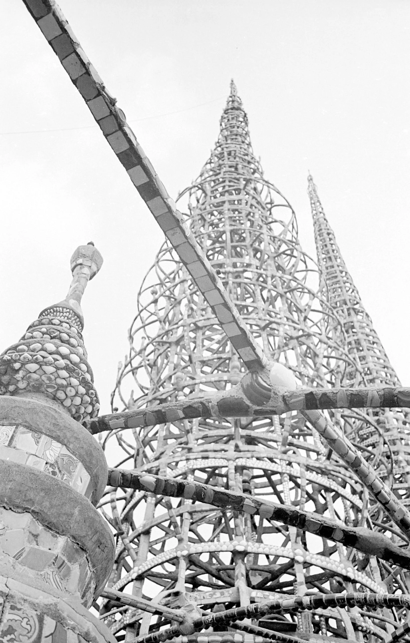 Black and white photograph looking up at tall, latticed metal spire structures encrusted with mosaic tile and shell fragments against a pale sky