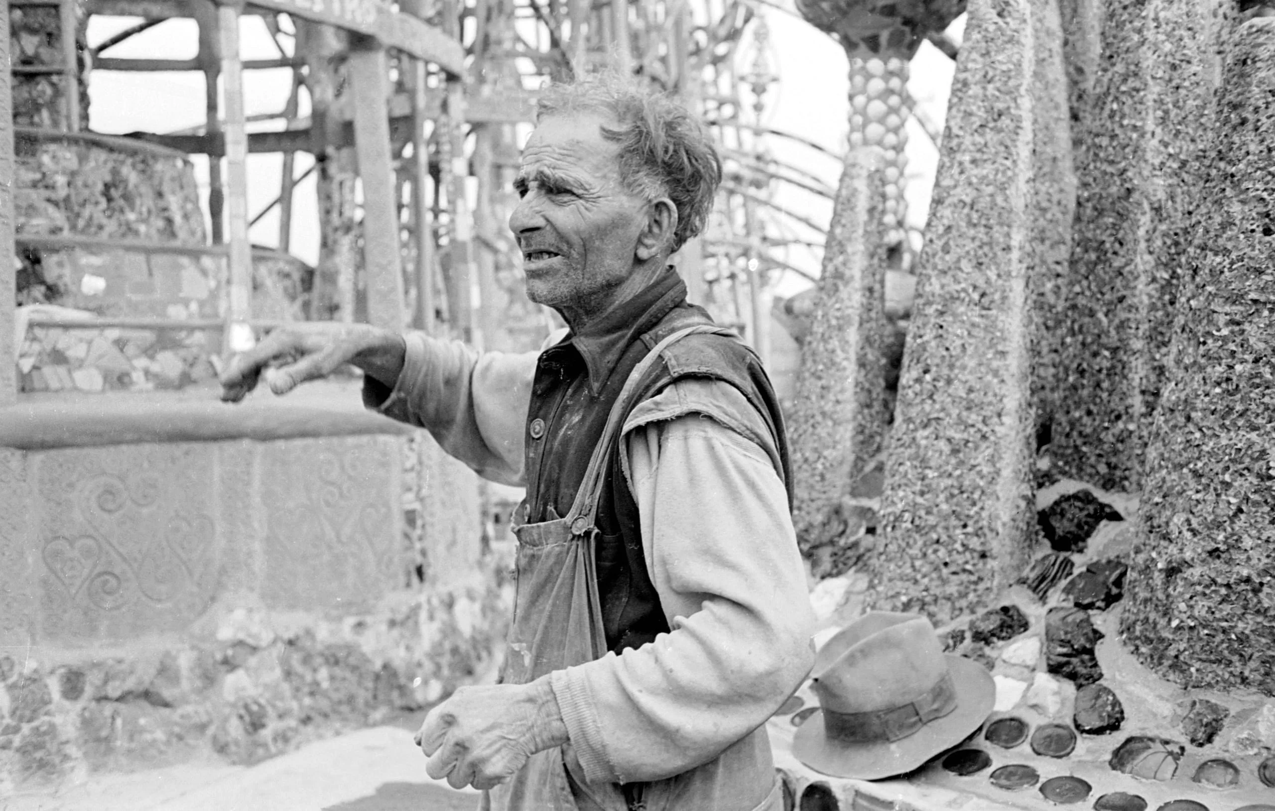 Black and white photograph of an older man in overalls and work shirt pointing to his left, surrounded by tall mosaic-covered columns and relief-carved walls