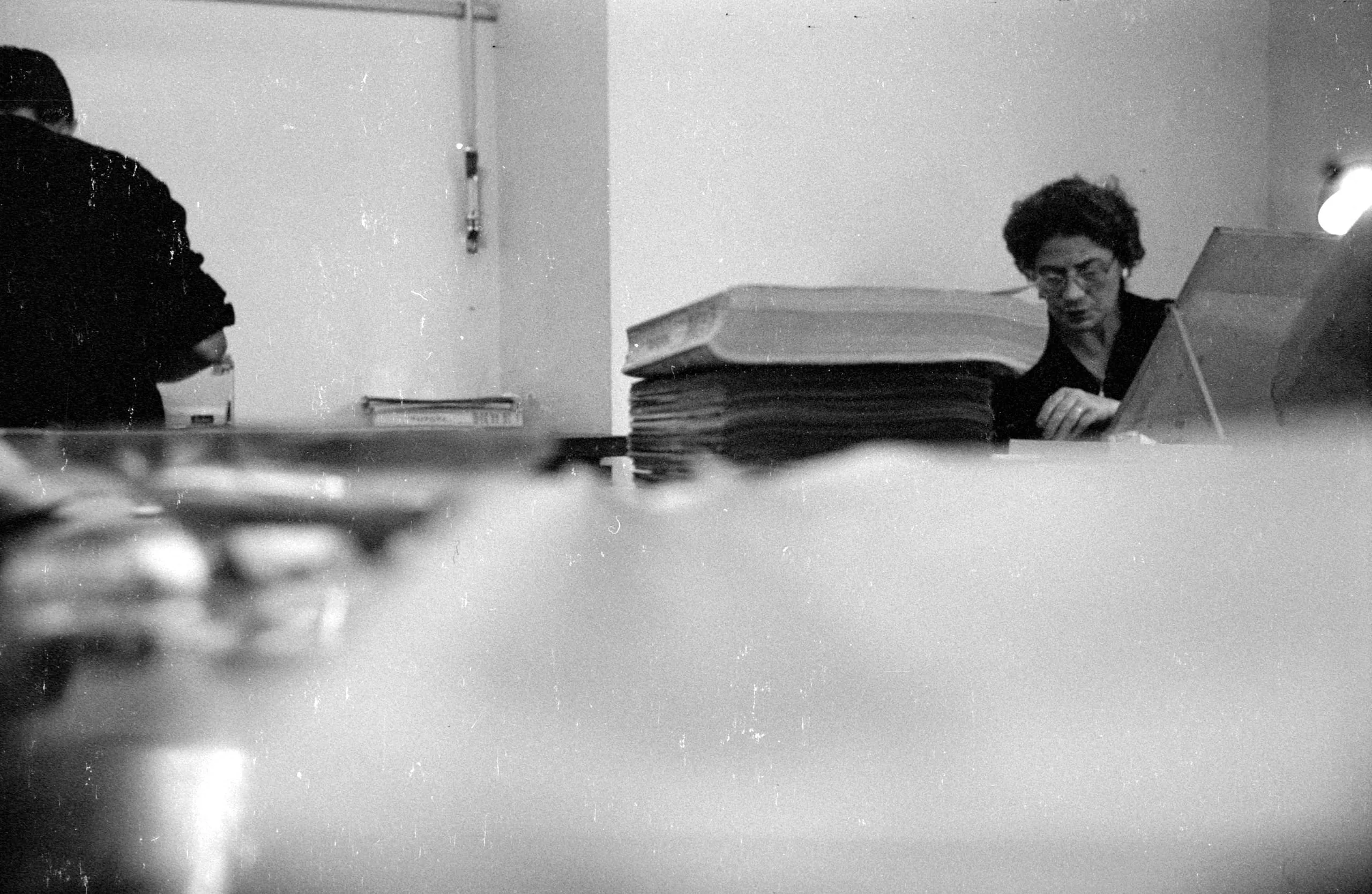 Black and white photograph of a woman with curly hair and glasses seated at a desk behind a tall stack of papers in an office interior