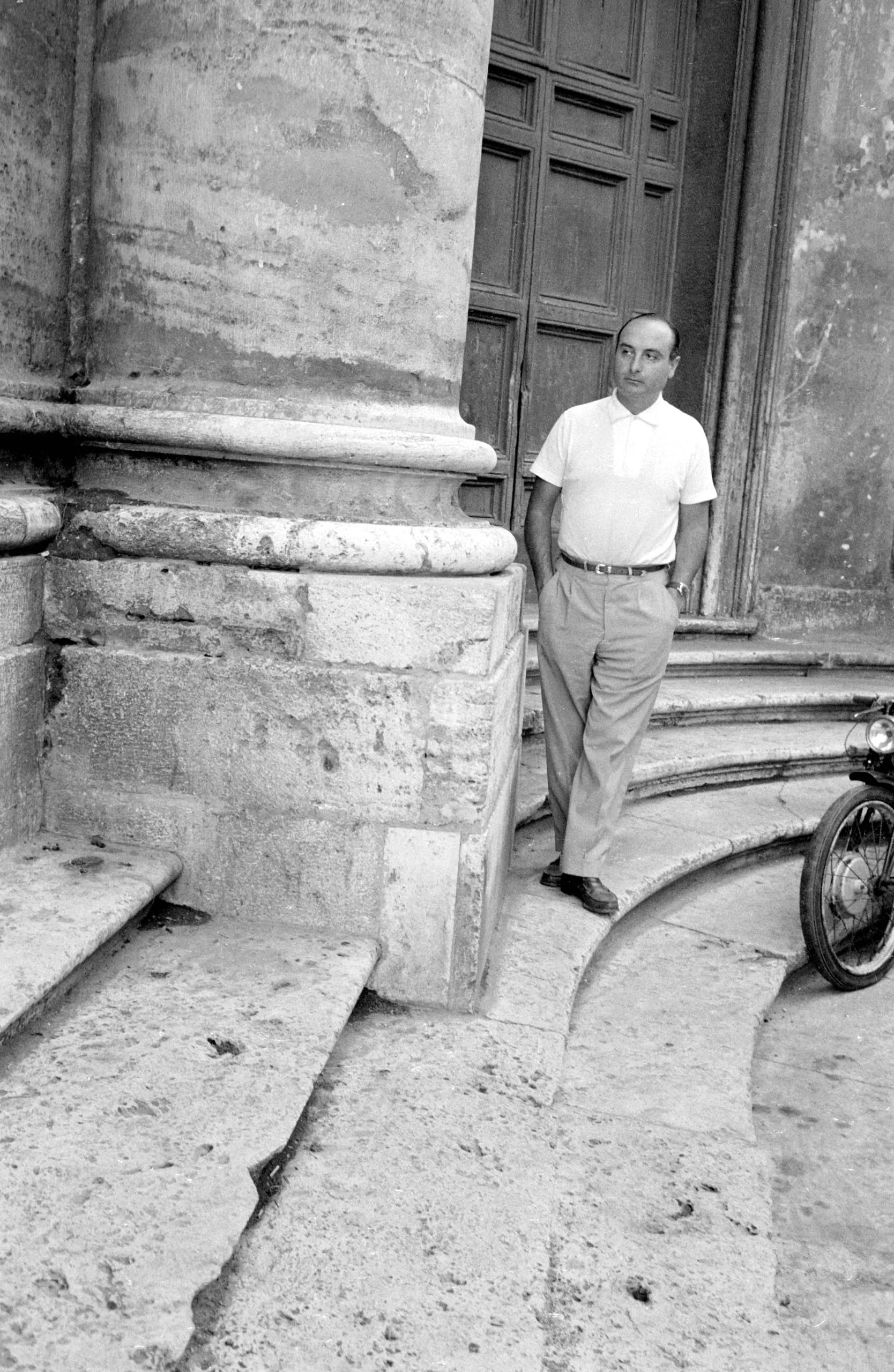 Black and white photograph of a man in a white polo shirt and light trousers standing beside a massive classical stone column and worn steps, with a wooden door behind him