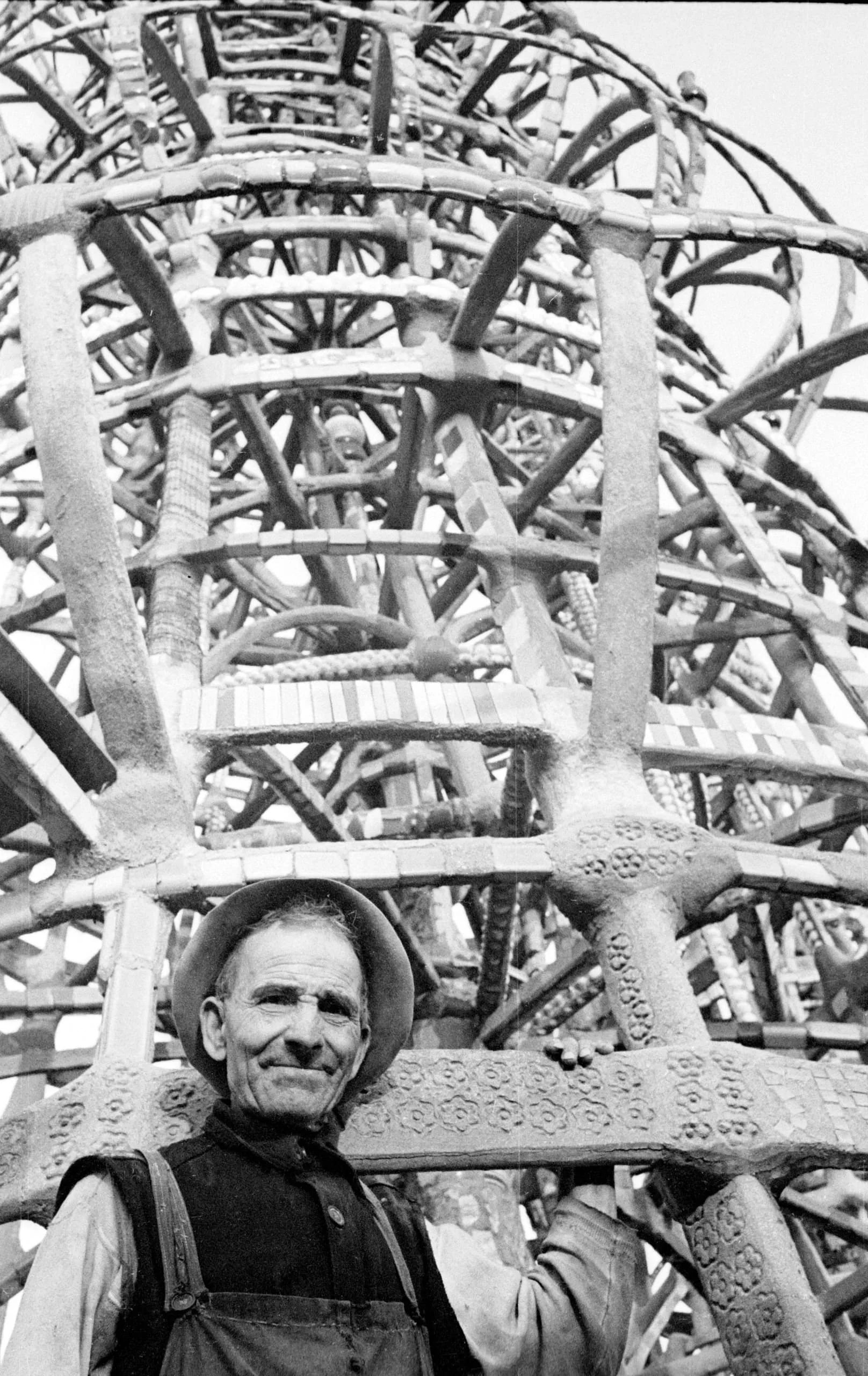 Black and white photograph of an older white man in a wide-brimmed hat and overalls standing before a towering latticed structure of rods and mosaic-covered crosspieces