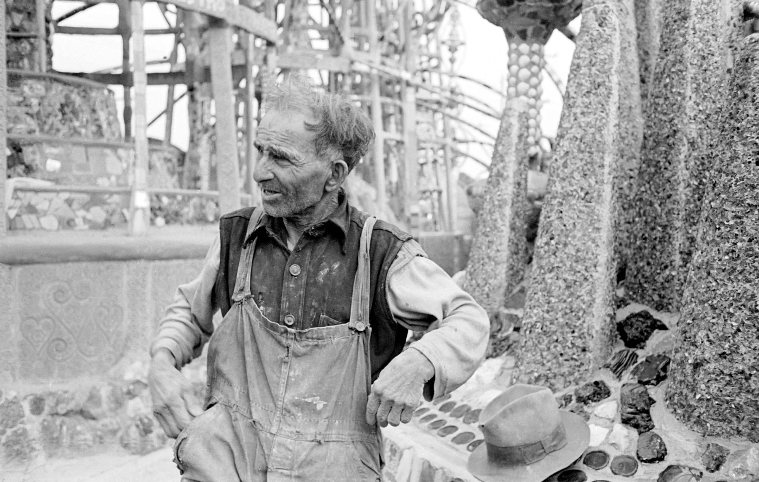 Black and white photograph of an elderly man in paint-spattered overalls standing among tall mosaic-encrusted columns and metal spire structures outdoors