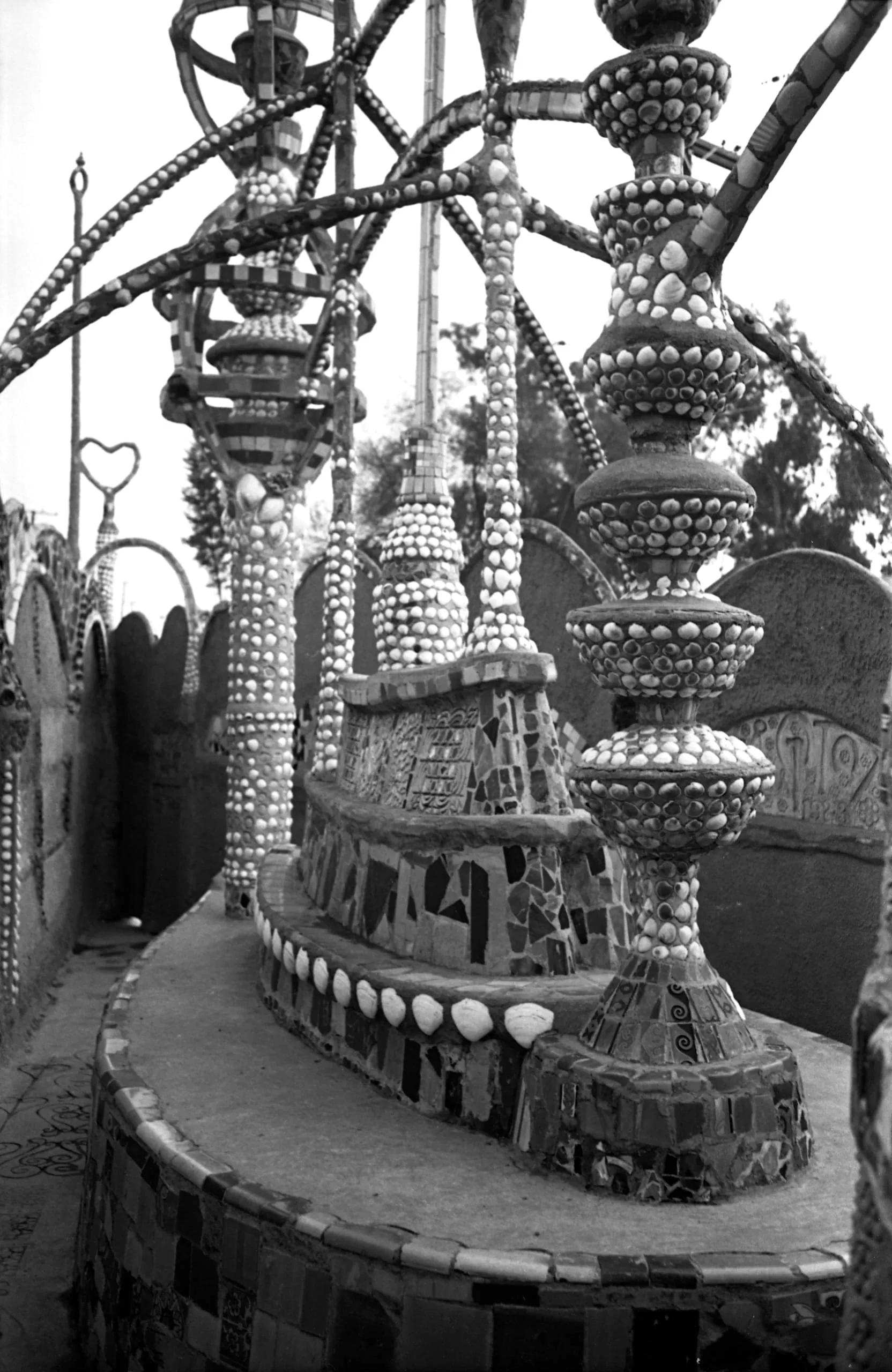 Black and white photograph of outdoor mosaic-covered columns encrusted with shells and broken tile, rising from a curved, decorated base