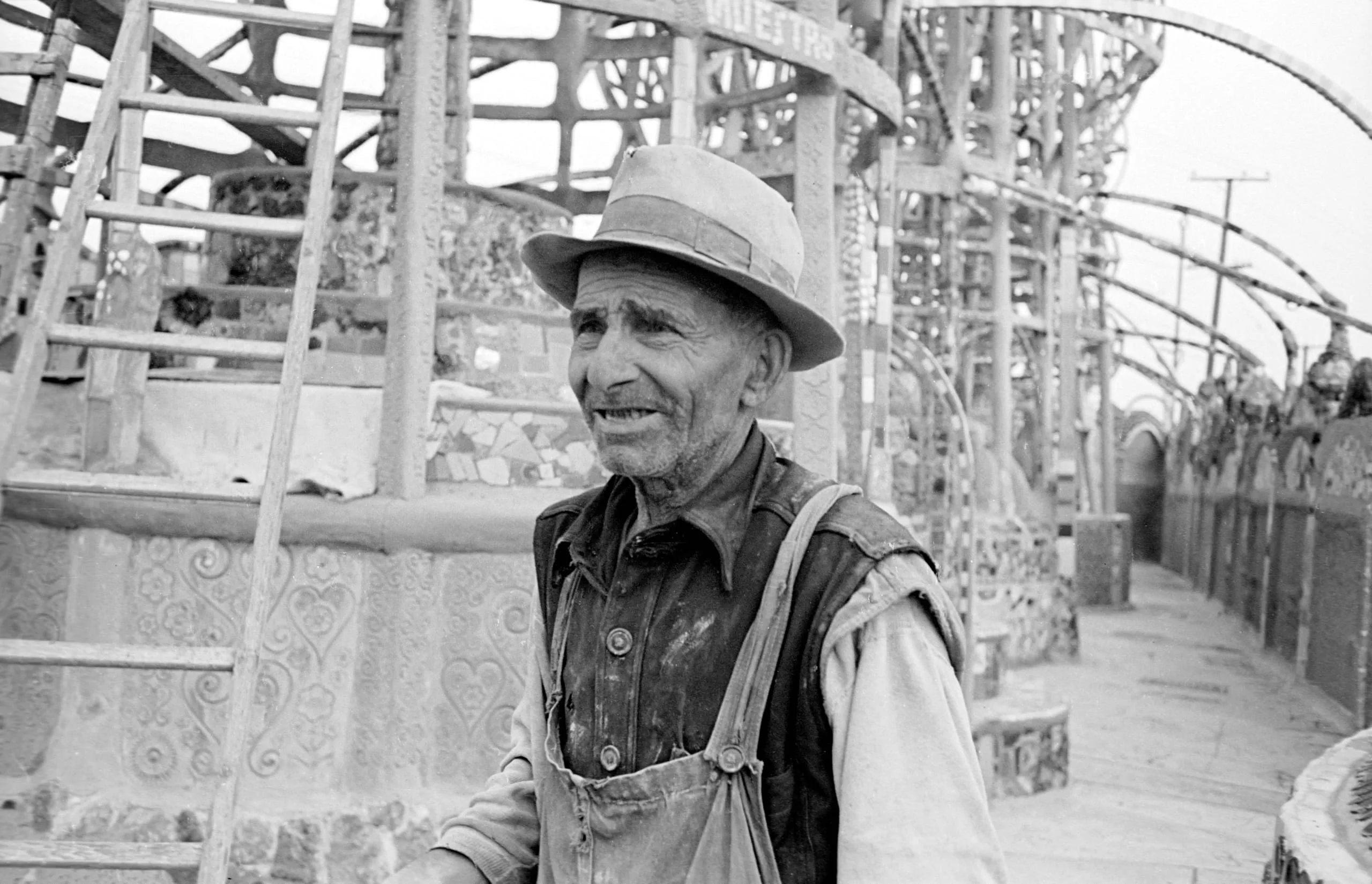 Black and white photograph, older man in paint-stained overalls and a fedora, chest-up portrait, standing before tall mosaic-covered outdoor structures