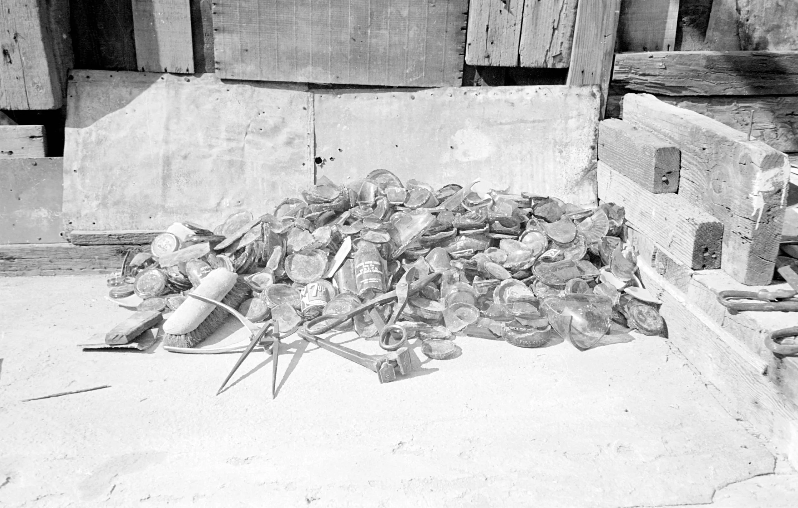 Black and white photograph of a pile of curved shell-like fragments, tin cans, a scrub brush, and scissors heaped on a sandy floor against rough wooden boards