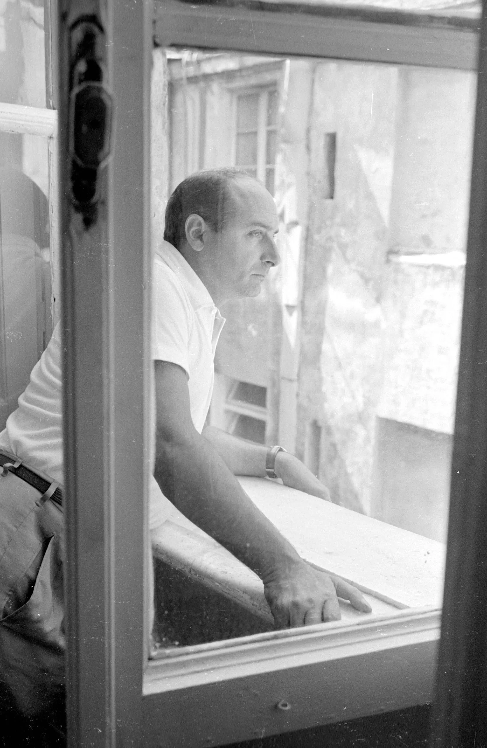 Black and white photograph of a white man in a white polo shirt leaning on a windowsill in profile, shot through a glass-paned door with a building visible behind him