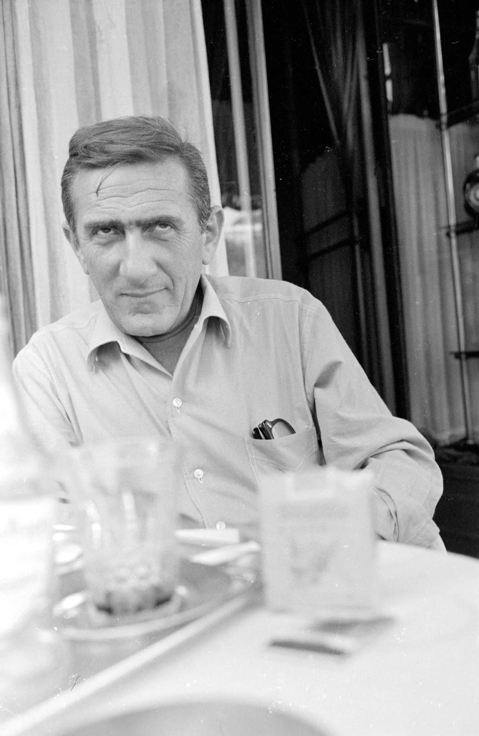 Black and white portrait photograph of a middle-aged white man in a collared shirt seated at a table, looking directly at the camera