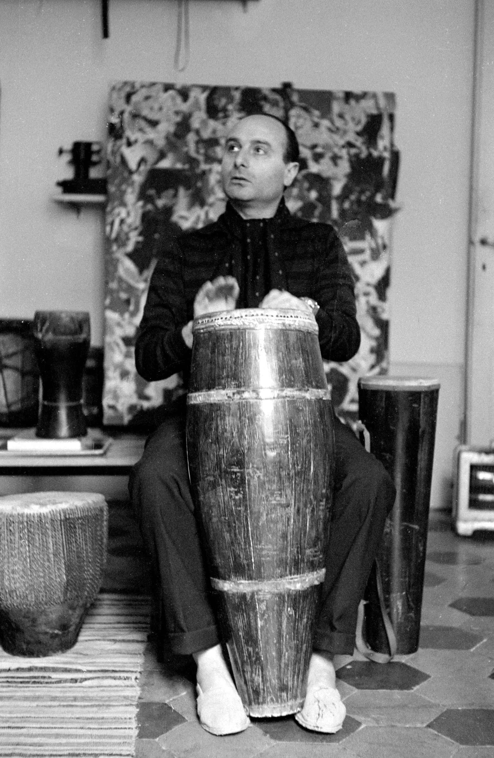 Black and white photograph of a seated man playing a tall barrel drum, surrounded by other drums and a large abstract painting in the background