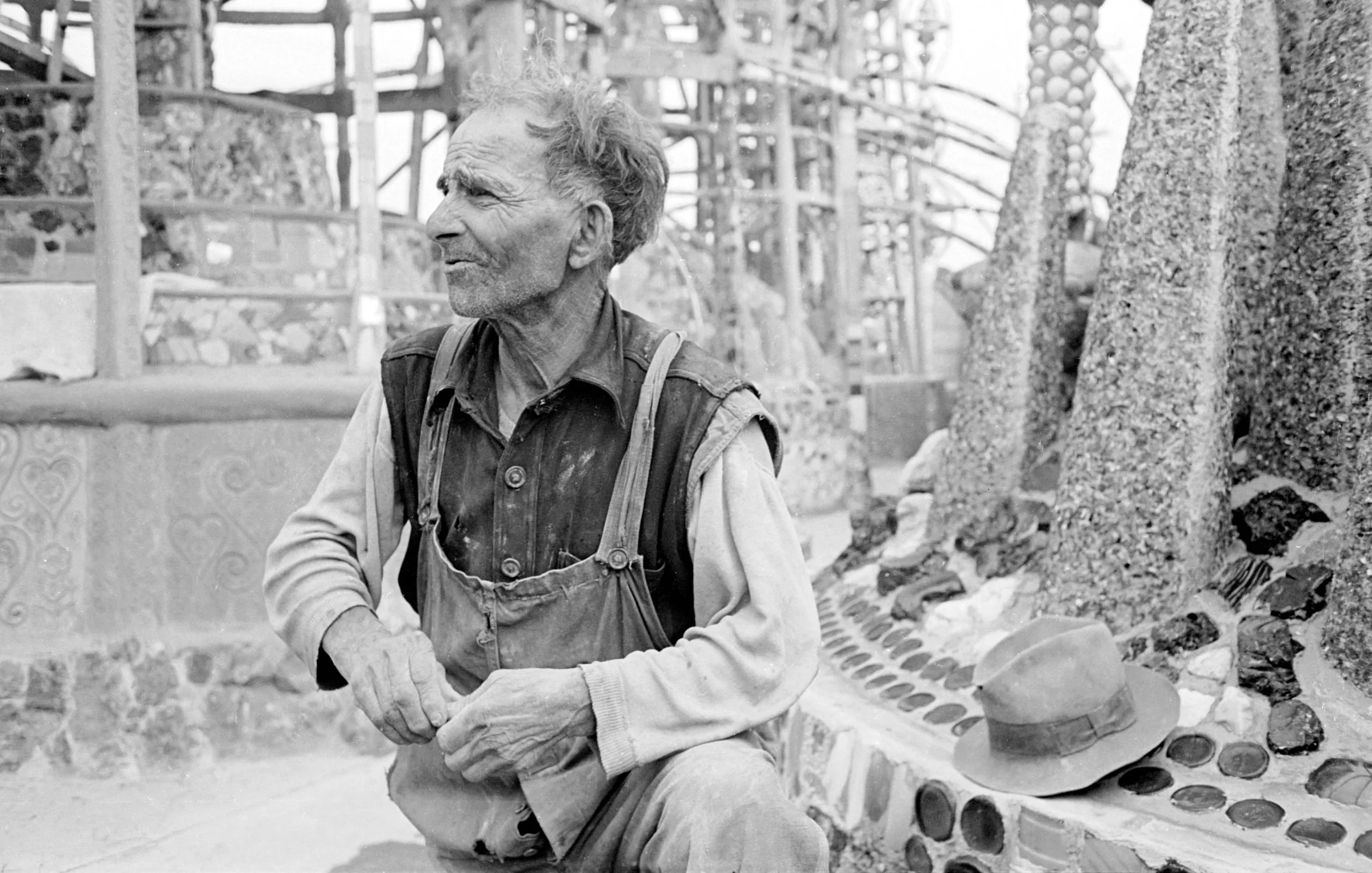 Black and white photograph of an elderly man in worn overalls and a work shirt, seated among large mosaic-covered columns and structures, looking up and to the left