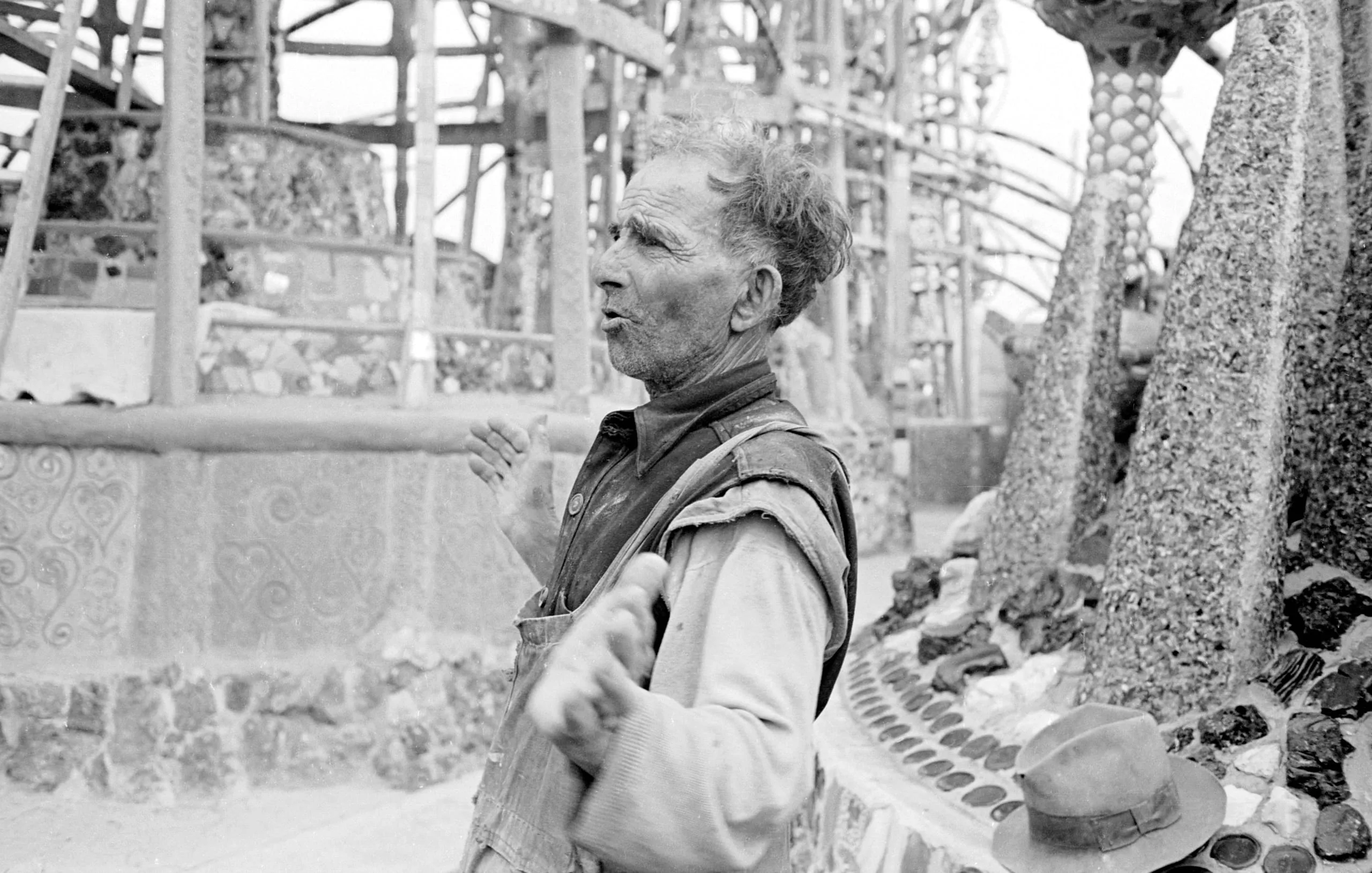 Black and white photograph of an older man in overalls gesturing with one hand, surrounded by large stone-and-mosaic encrusted outdoor structures