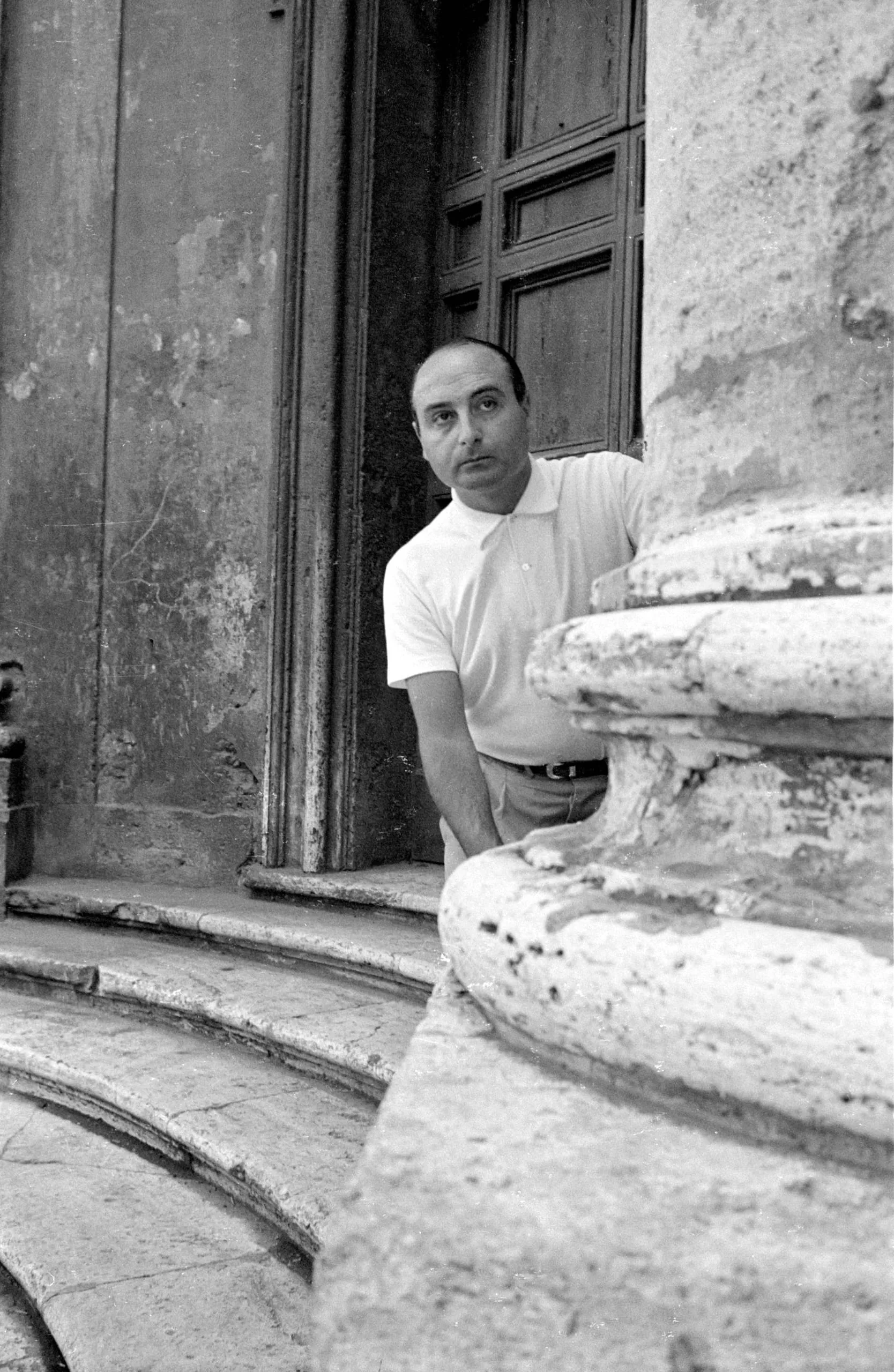 Black and white photograph, a man in a white short-sleeved shirt leans against a weathered stone balustrade in a doorway of an aged building