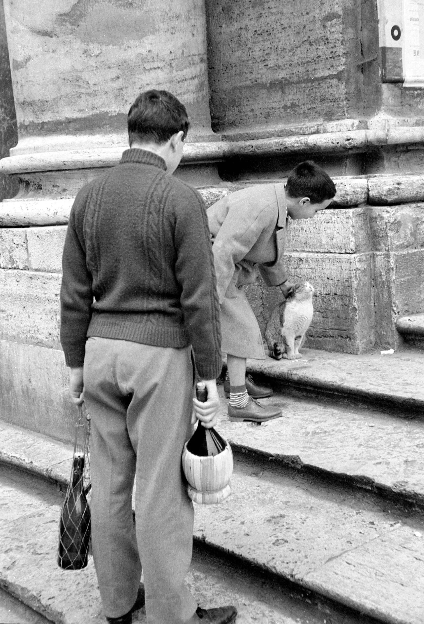 Black and white photograph of two boys on stone steps, one bending to pet a small cat, the other standing with his back to the camera holding a wicker-wrapped bottle