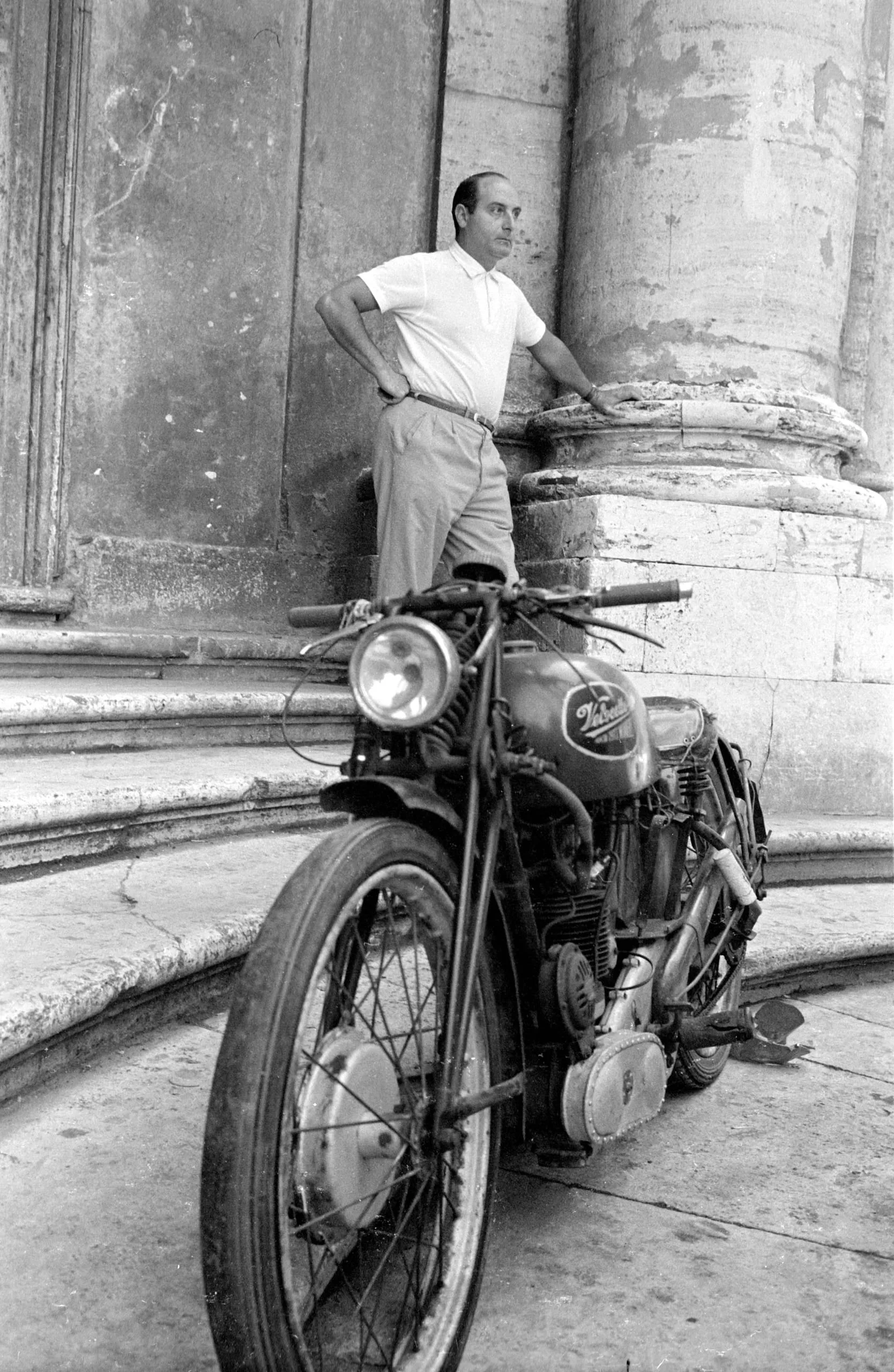 Black and white photograph of a man in a white polo shirt leaning against a stone column behind a vintage motorcycle parked on stone steps