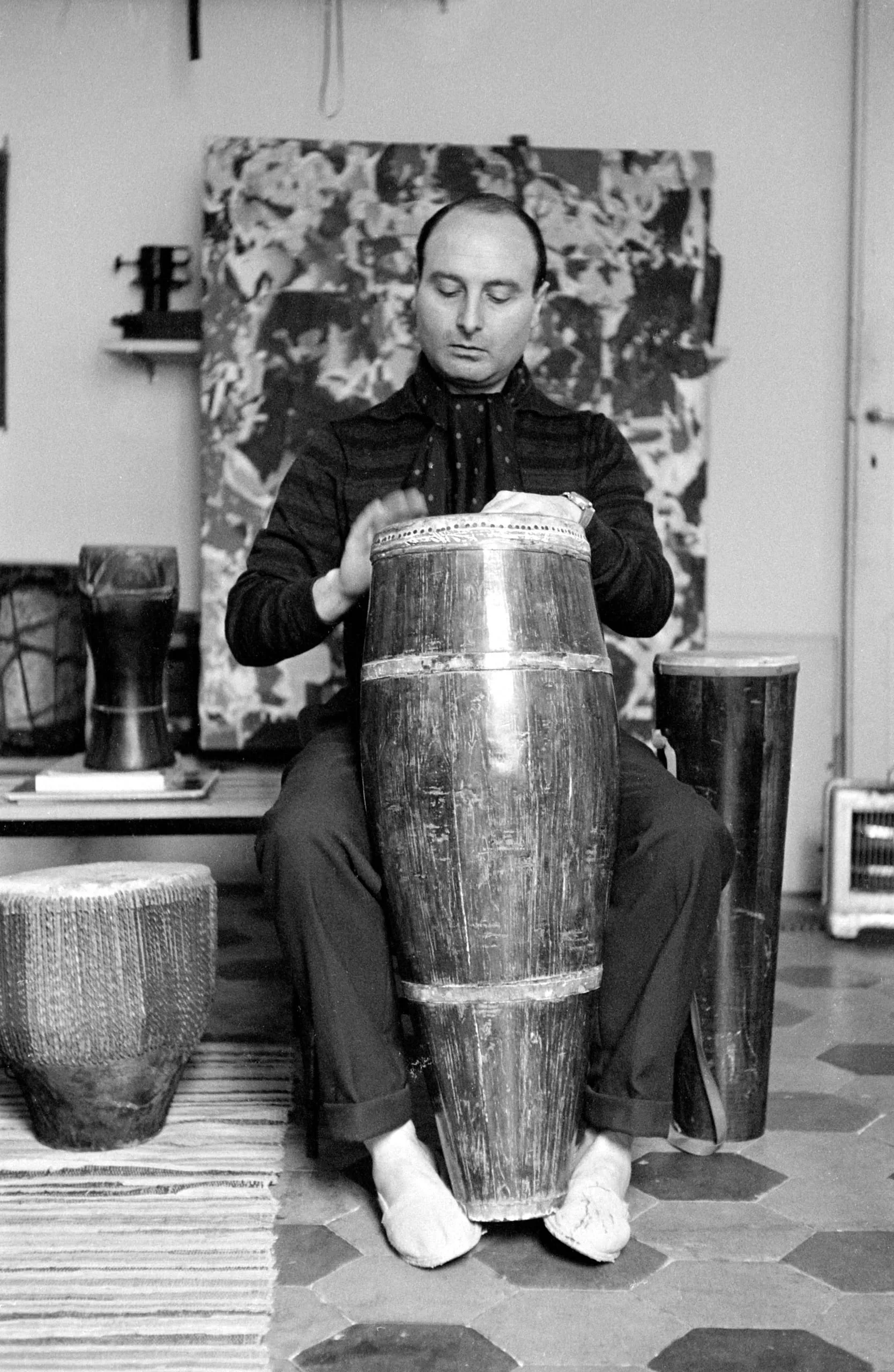 Black and white photograph of a bald man in a striped sweater seated and holding a large barrel drum between his knees in a studio interior