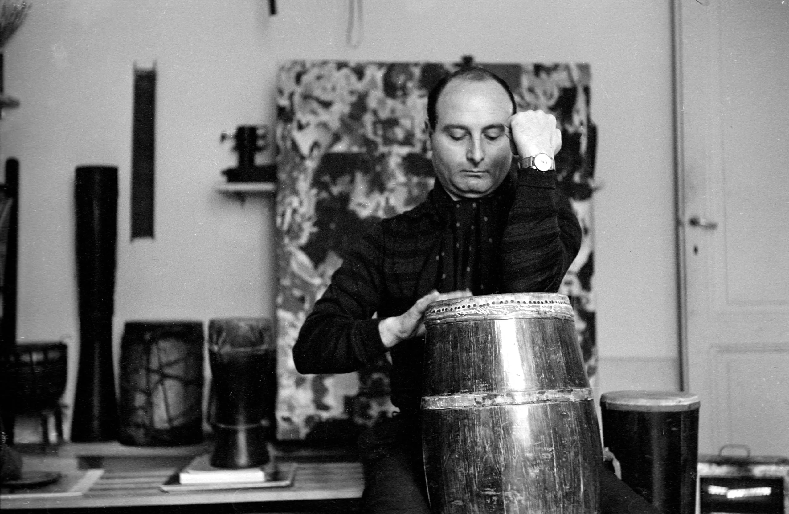 Black and white photograph of a man leaning over a wooden barrel in an artist's studio, with drums and an abstract painting visible in the background