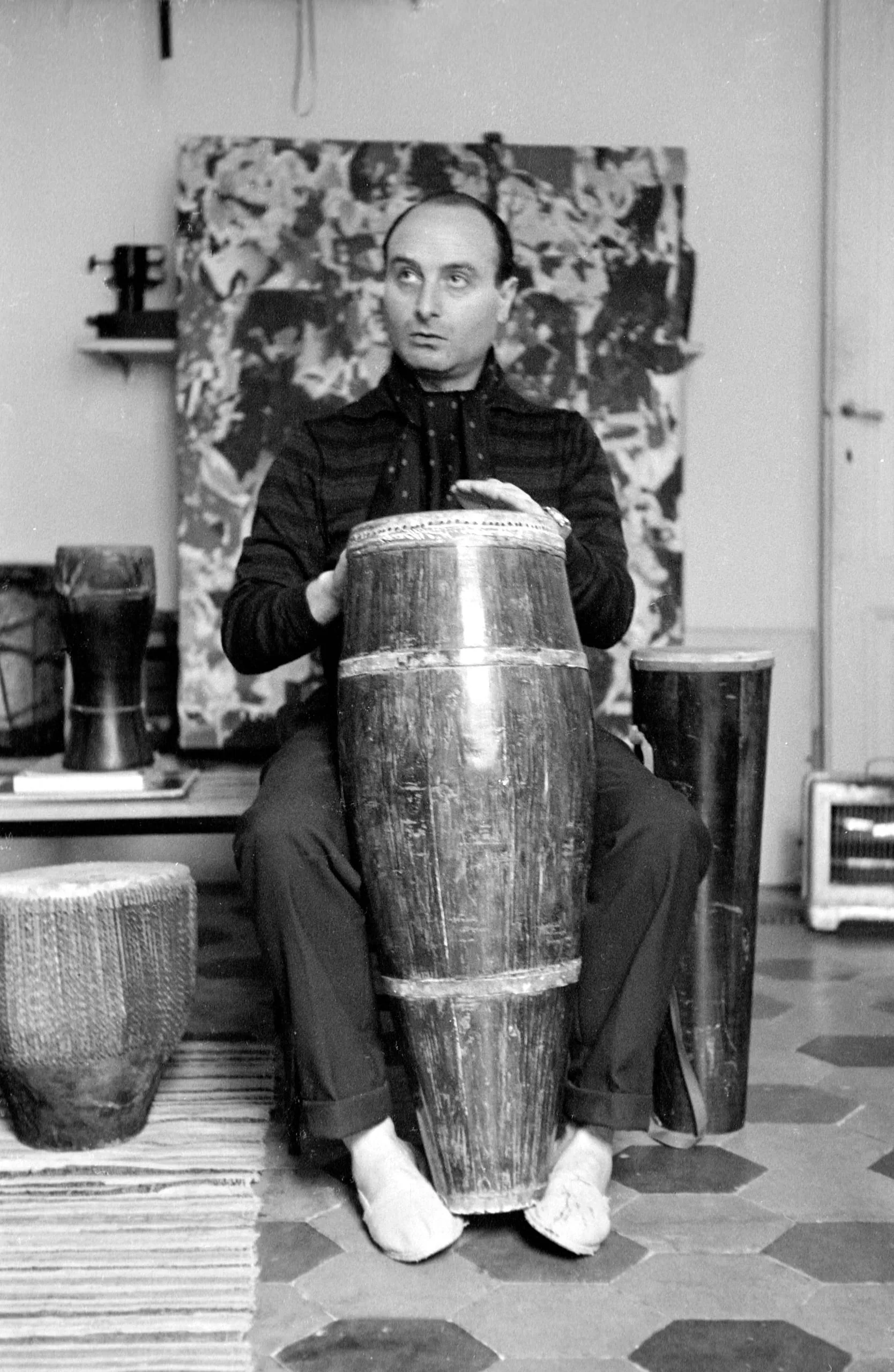 Black and white photograph of a seated man holding a tall barrel drum between his knees, surrounded by other drums and a large abstract painting in a studio