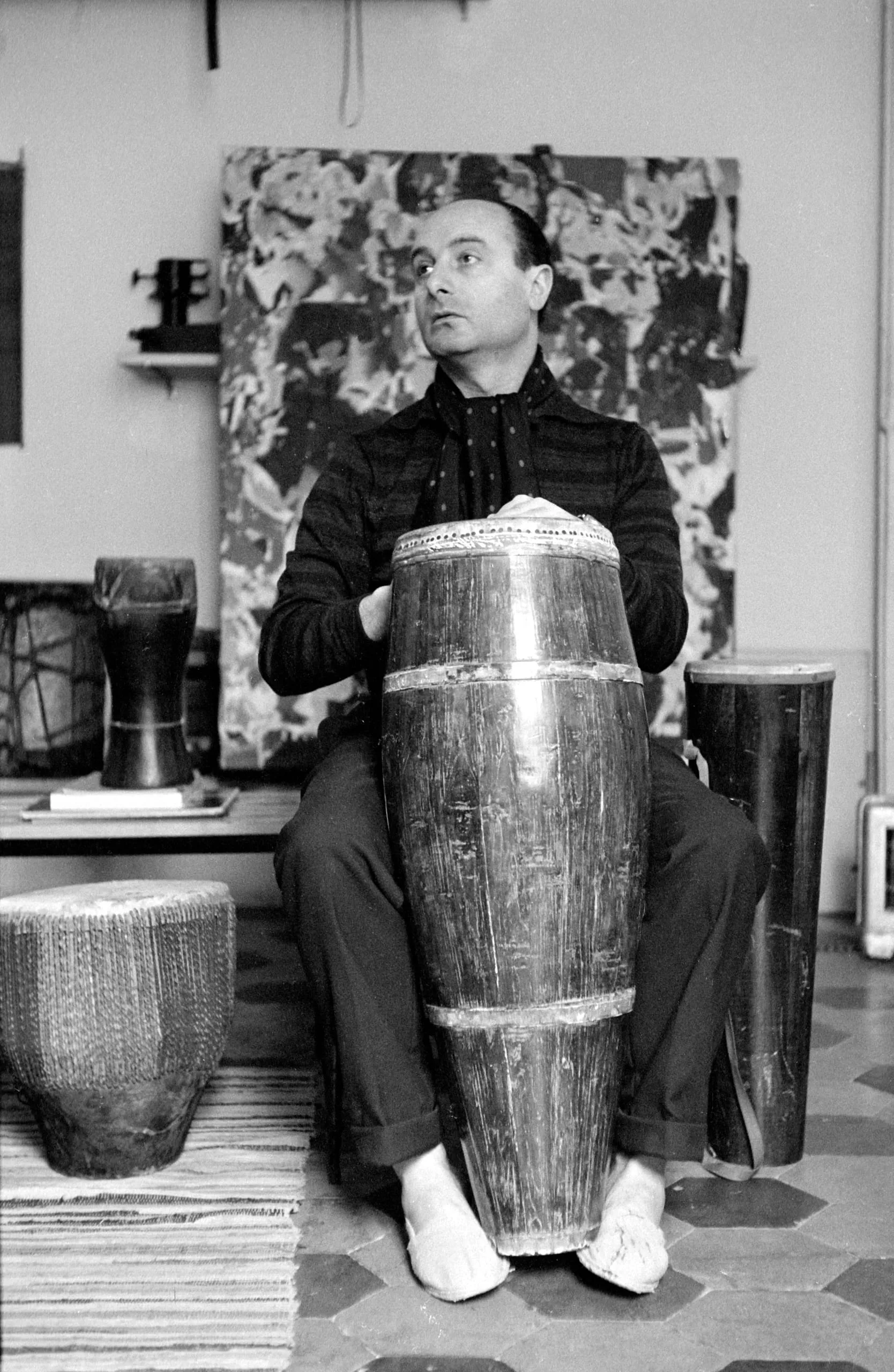 Black and white photograph of a seated white man holding a large barrel-shaped drum between his knees in an artist's studio, surrounded by additional drums