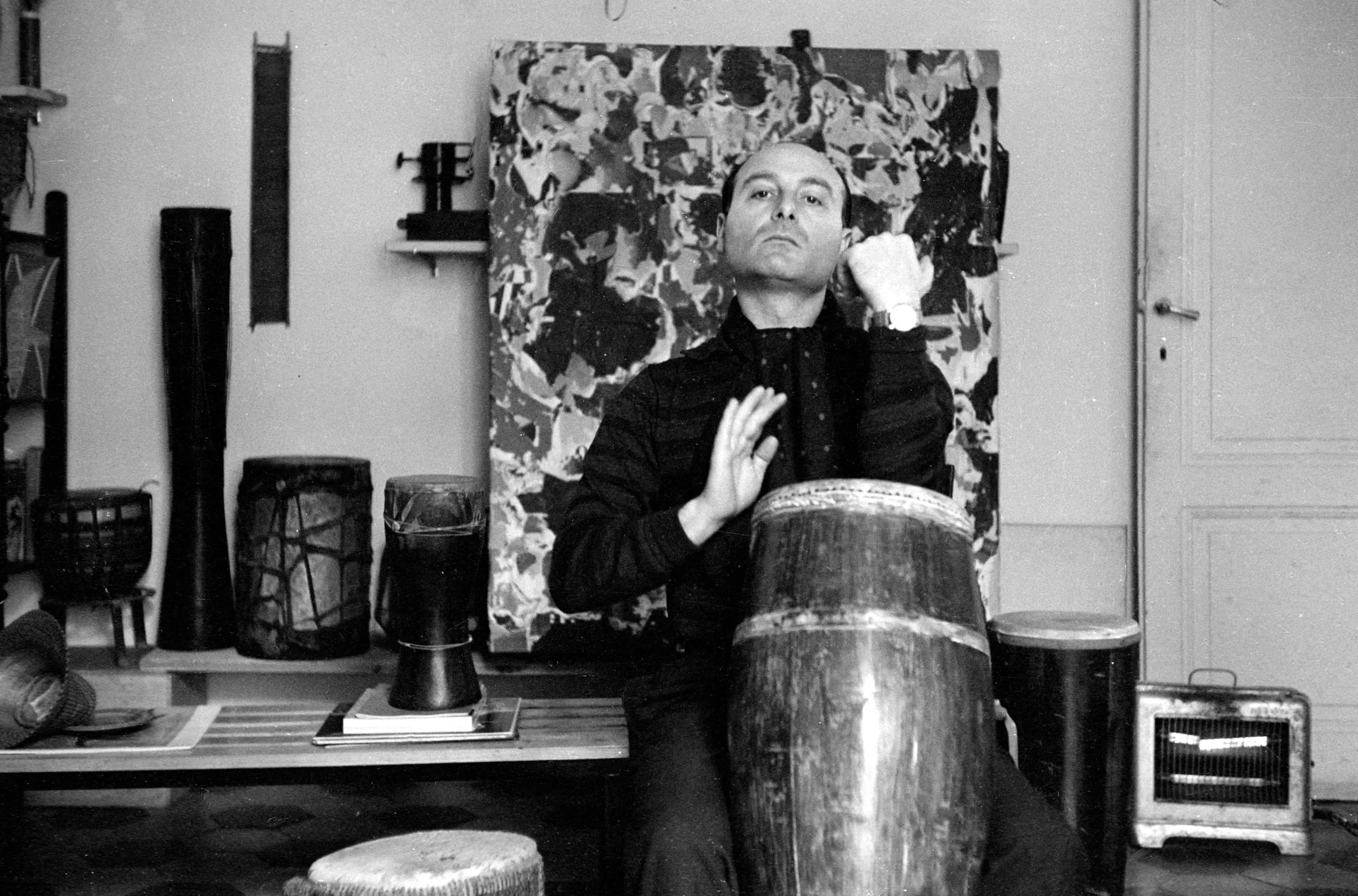 Black and white photograph of a shaved-head man in a black shirt seated on a studio floor among tall drums, head tilted back, one hand raised