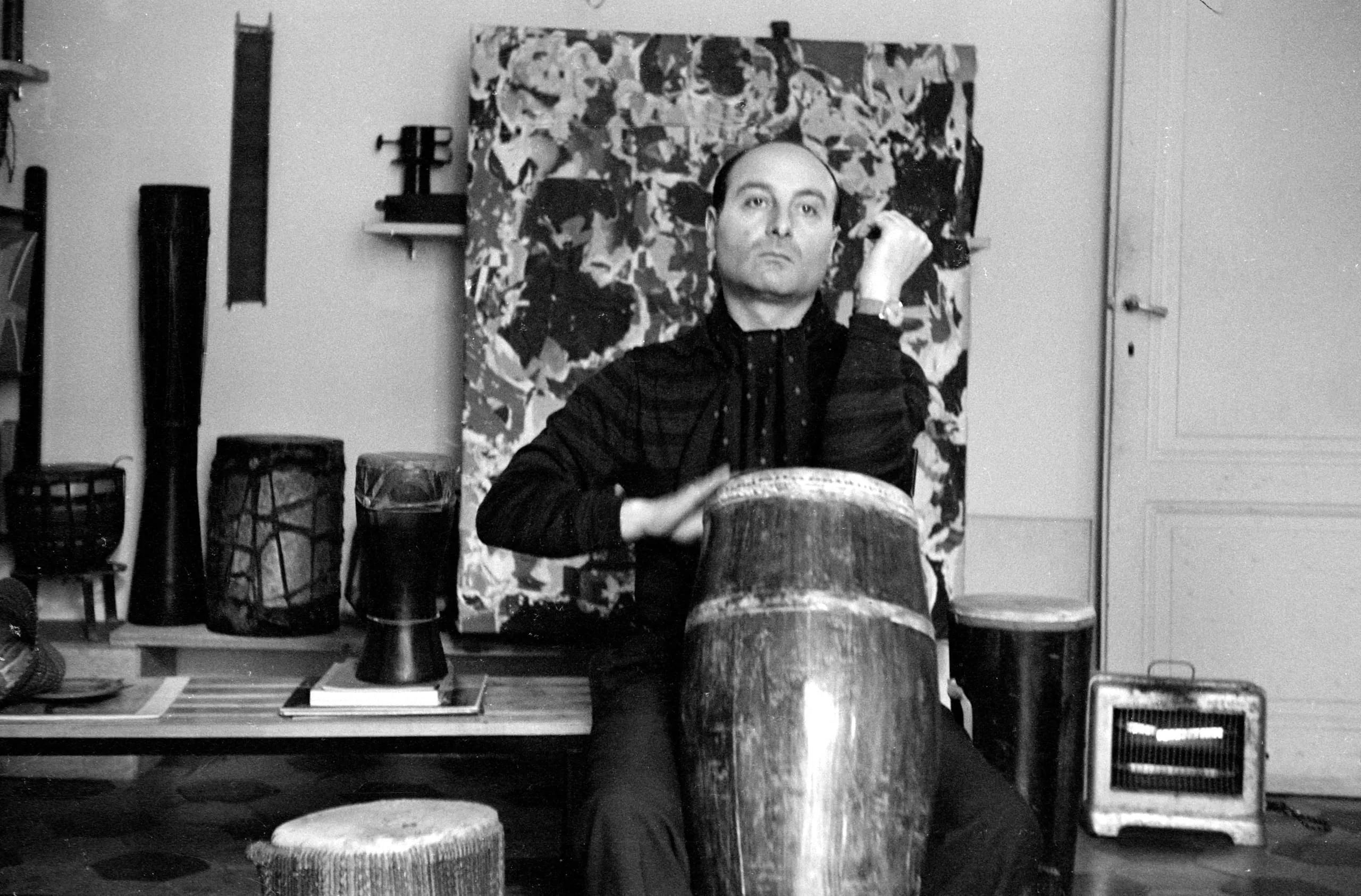 Black and white photograph of a bald white man seated on a studio floor beside a tall conga drum, an abstract painting visible on the wall behind him