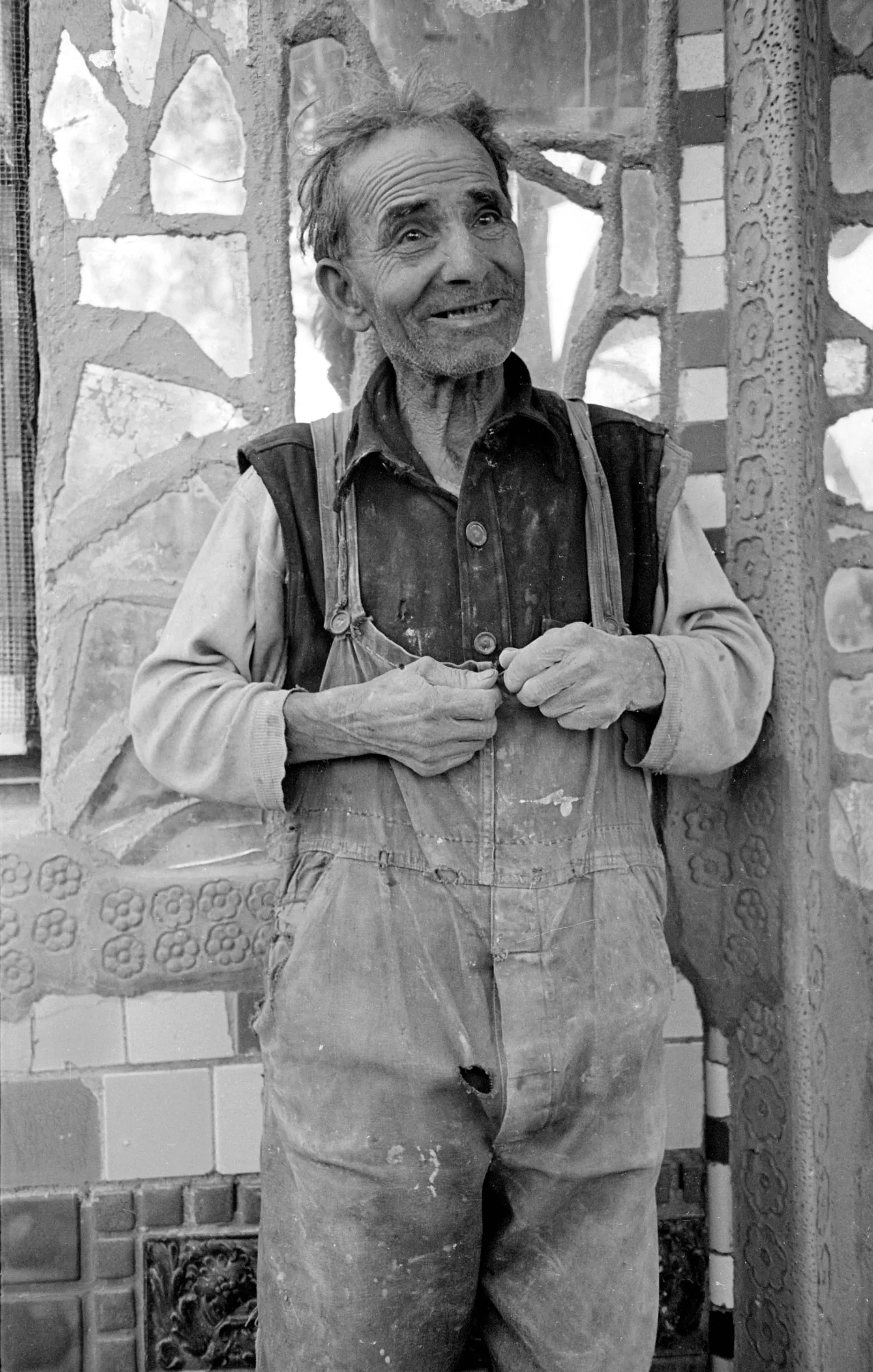 Black and white photograph, full-length portrait of an elderly white man in stained denim overalls, smiling upward, standing before a mosaic tile column