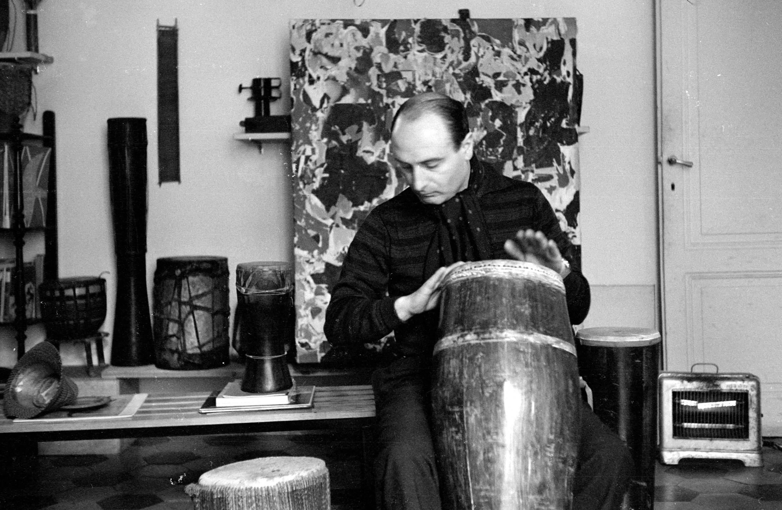 Black and white photograph of a man in a dark shirt seated and playing a tall hand drum in a studio, surrounded by drums, objects, and an abstract painting